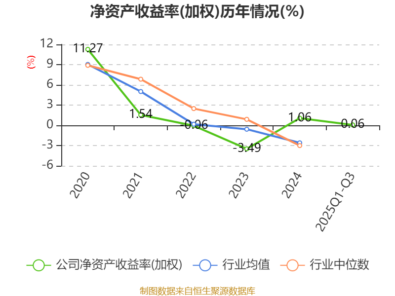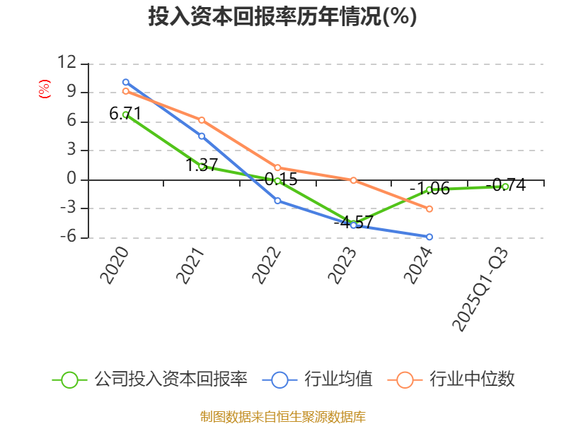 盈利能力方面, 2025年前三季度公司加权平均净资产收益率为0.06%,同比下降1.45个百分点。公司2025年前三季度投入资本回报率为-0.74%,较上年同期下降1.55个百分点。