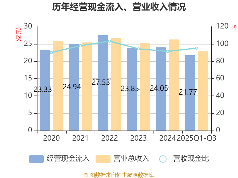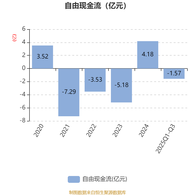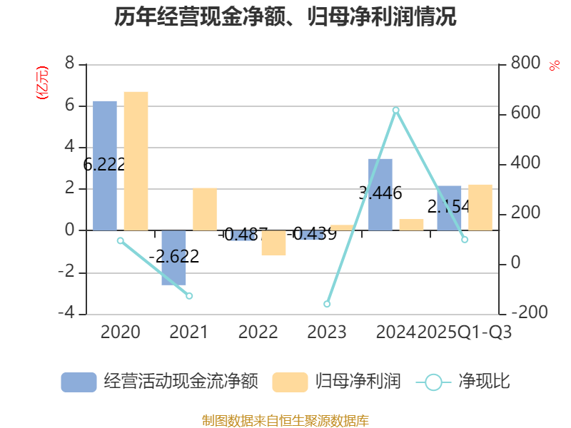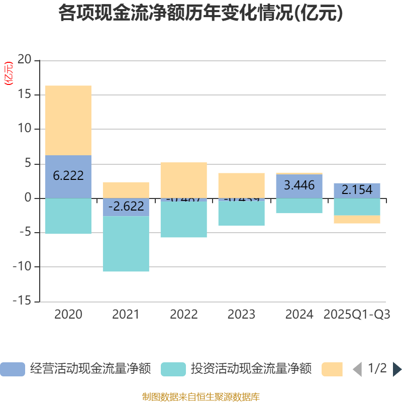 2025年前三季度,公司经营活动现金流净额为2.15亿元,同比下降35.13%;筹资活动现金流净额-1.15亿元,同比减少2711.76万元;投资活动现金流净额-2.52亿元,上年同期为-1.67亿元。