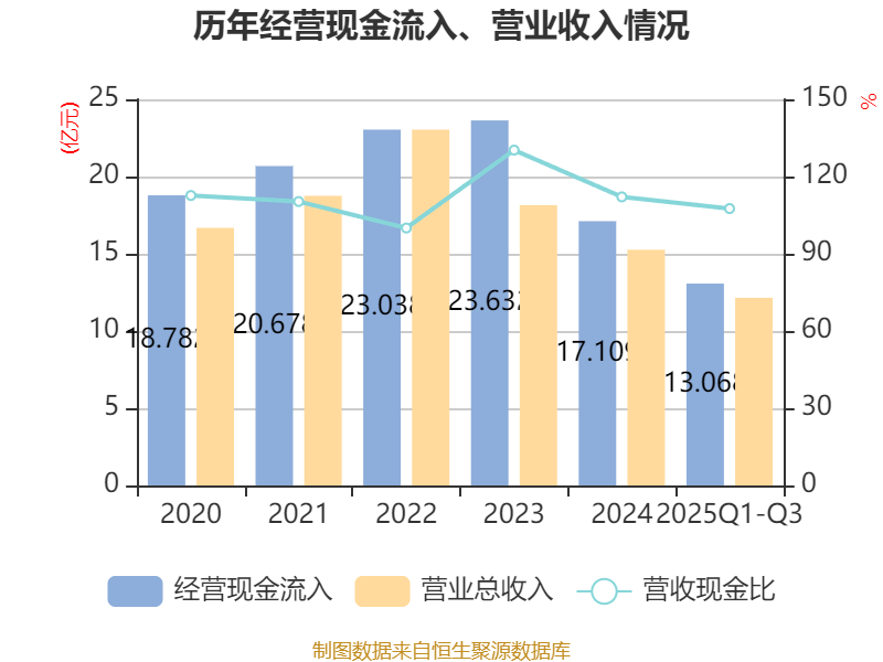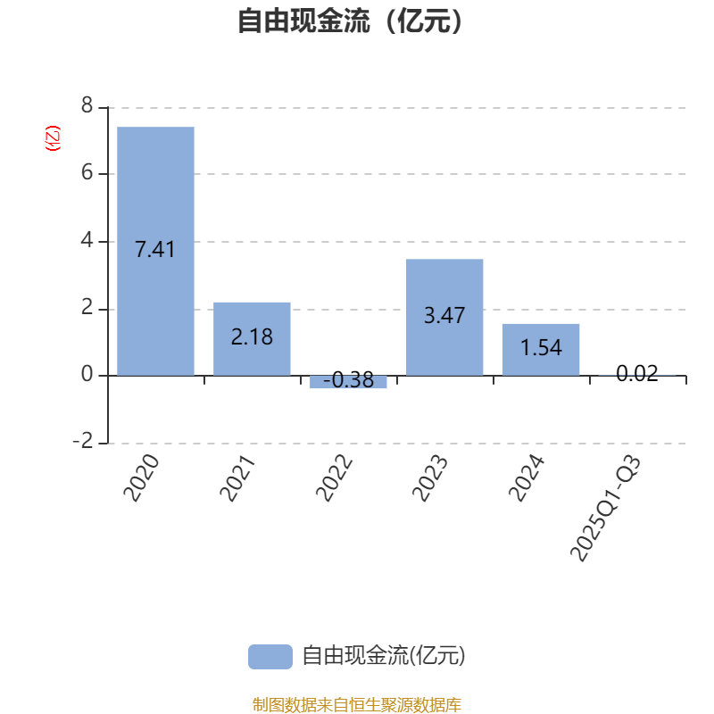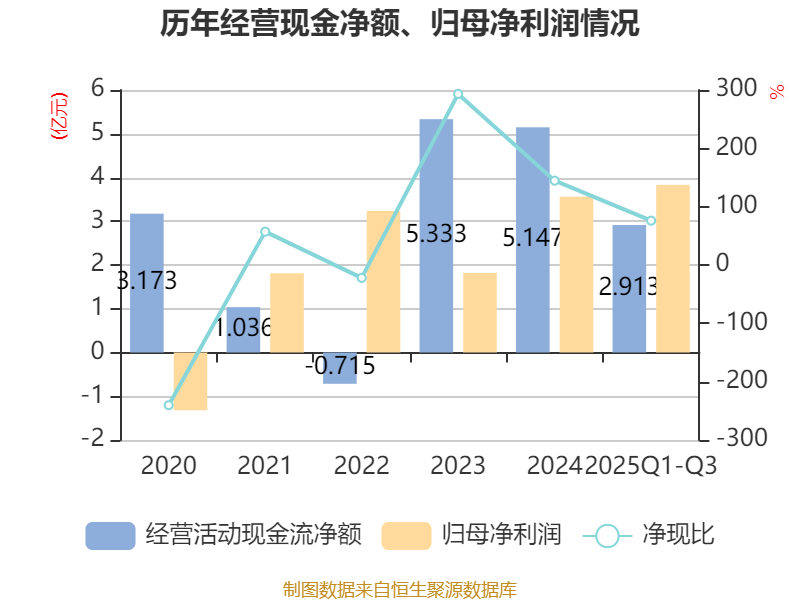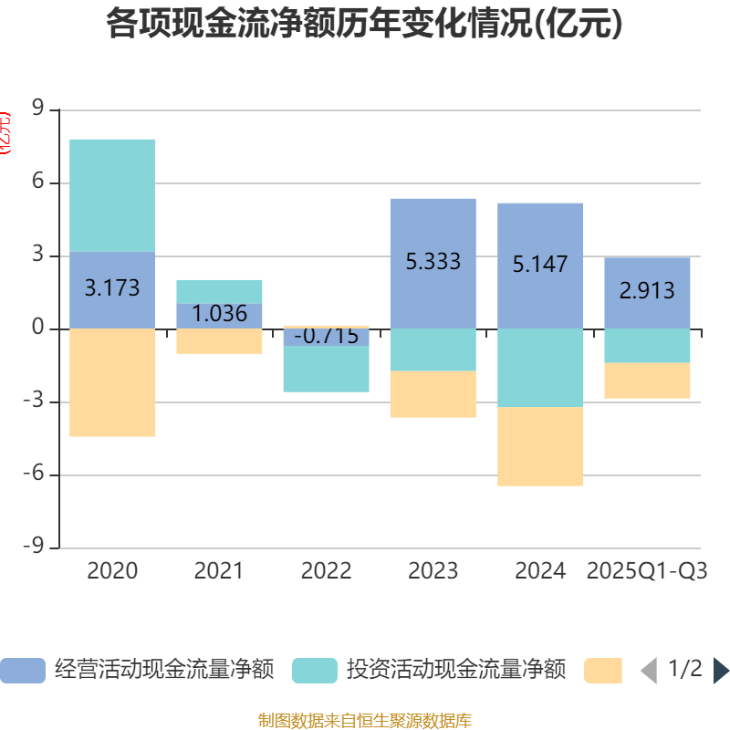 2025年前三季度,公司经营活动现金流净额为2.91亿元,同比下降35.36%;筹资活动现金流净额-1.46亿元,同比增加1.79亿元;投资活动现金流净额-1.42亿元,上年同期为-5877.76万元。