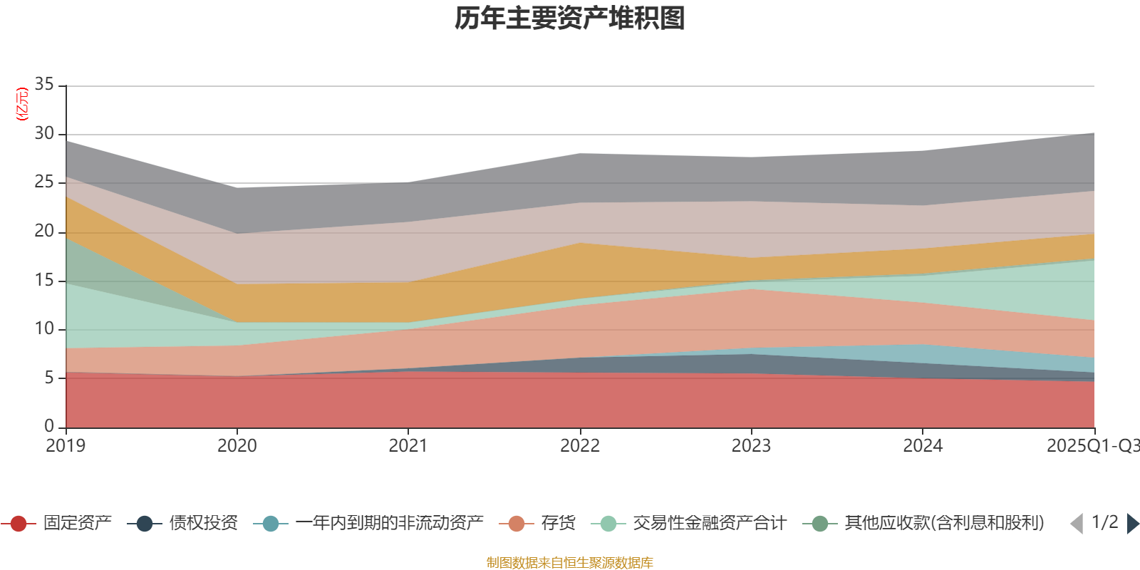 资产重大变化方面,截至2025年三季度末,公司交易性金融资产合计较上年末增加122.93%,占公司总资产比重上升10.57个百分点;债权投资较上年末减少39.97%,占公司总资产比重下降2.4个百分点;存货较上年末减少10.27%,占公司总资产比重下降2.38个百分点;固定资产较上年末减少6.57%,占公司总资产比重下降2.18个百分点。