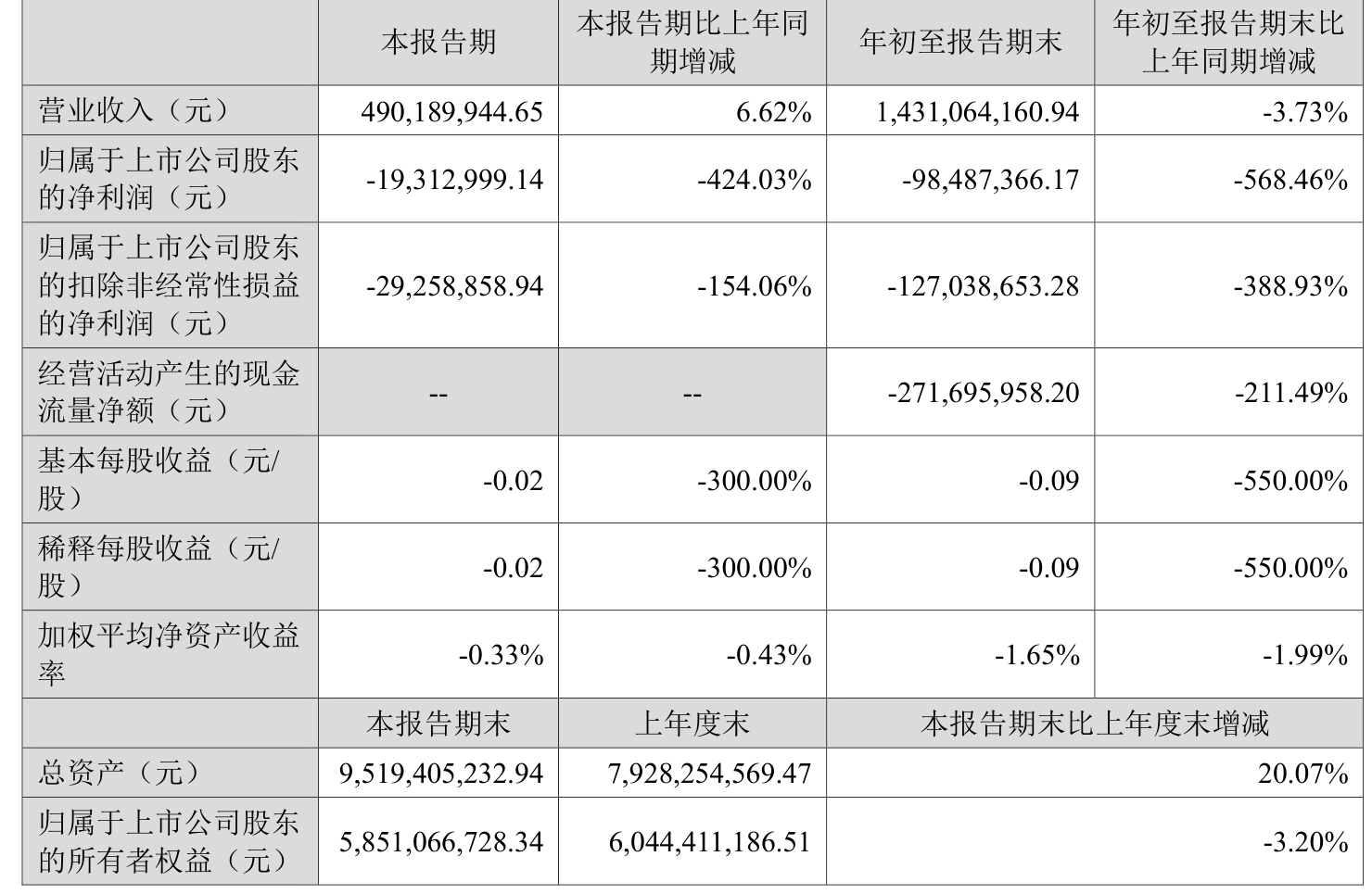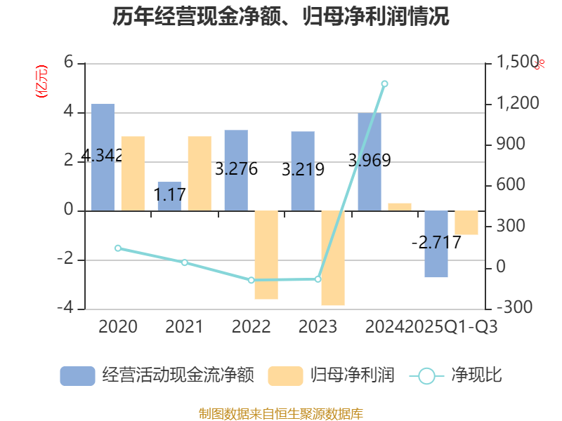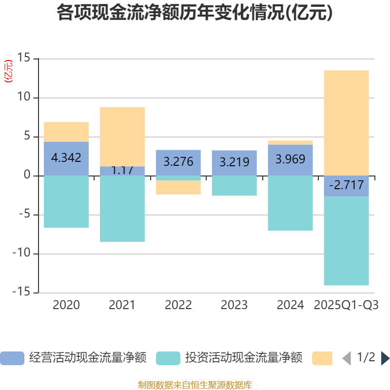 2025年前三季度,公司经营活动现金流净额为-2.72亿元,同比减少1.84亿元;筹资活动现金流净额13.48亿元,同比增加13.48亿元;投资活动现金流净额-11.37亿元,上年同期为-4.9亿元。