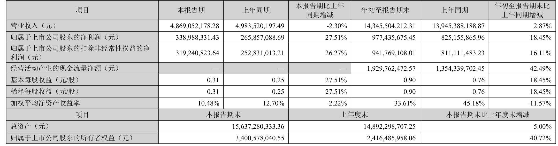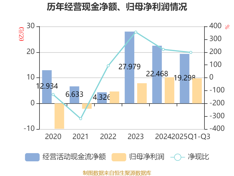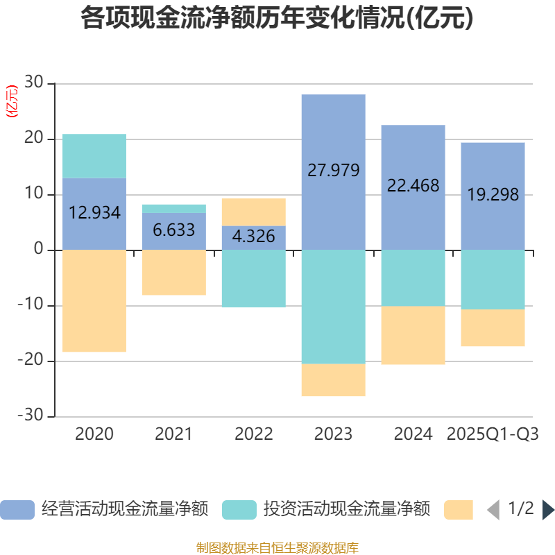 2025年前三季度,公司经营活动现金流净额为19.3亿元,同比增长42.49%;筹资活动现金流净额-6.65亿元,同比减少6.32亿元;投资活动现金流净额-10.75亿元,上年同期为-5.24亿元。