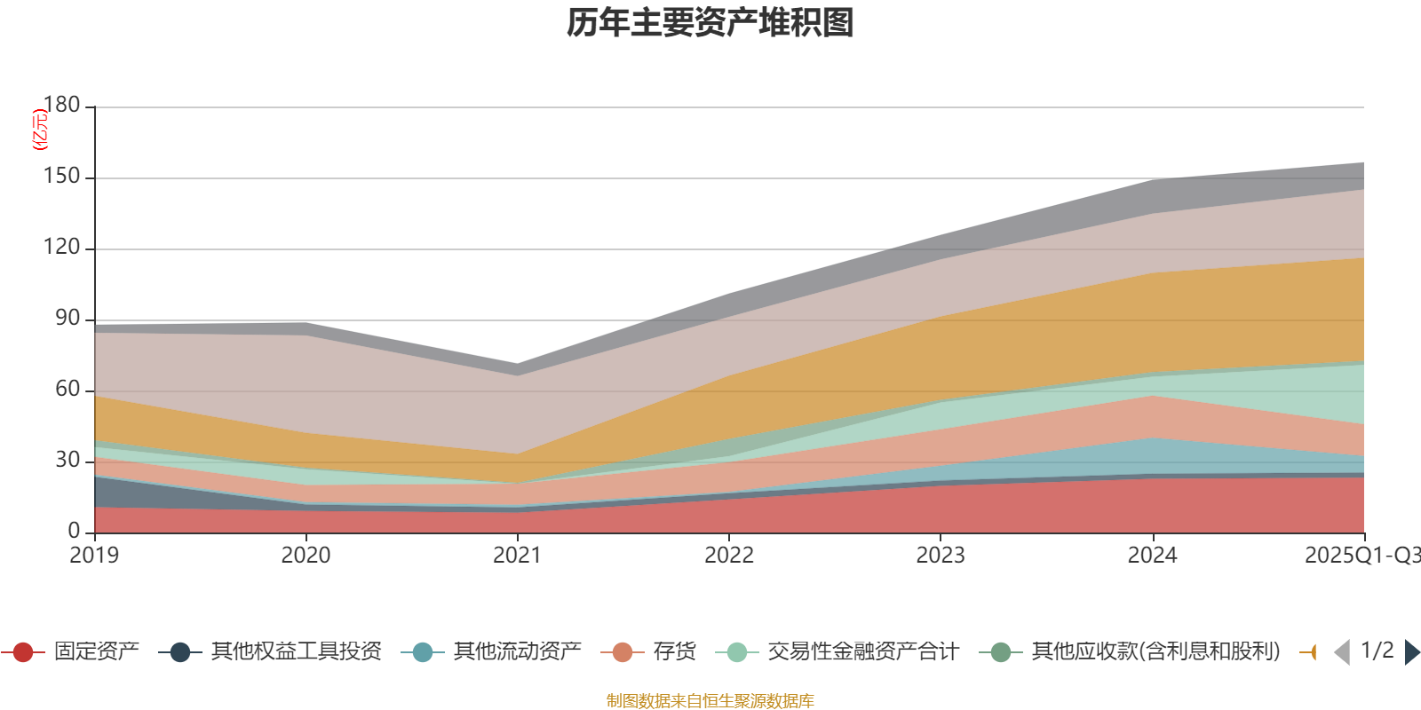 资产重大变化方面,截至2025年三季度末,公司交易性金融资产合计较上年末增加212.91%,占公司总资产比重上升10.63个百分点;其他流动资产较上年末减少53.62%,占公司总资产比重下降5.71个百分点;存货较上年末减少24.27%,占公司总资产比重下降3.32个百分点;货币资金较上年末增加15.25%,占公司总资产比重上升1.64个百分点。