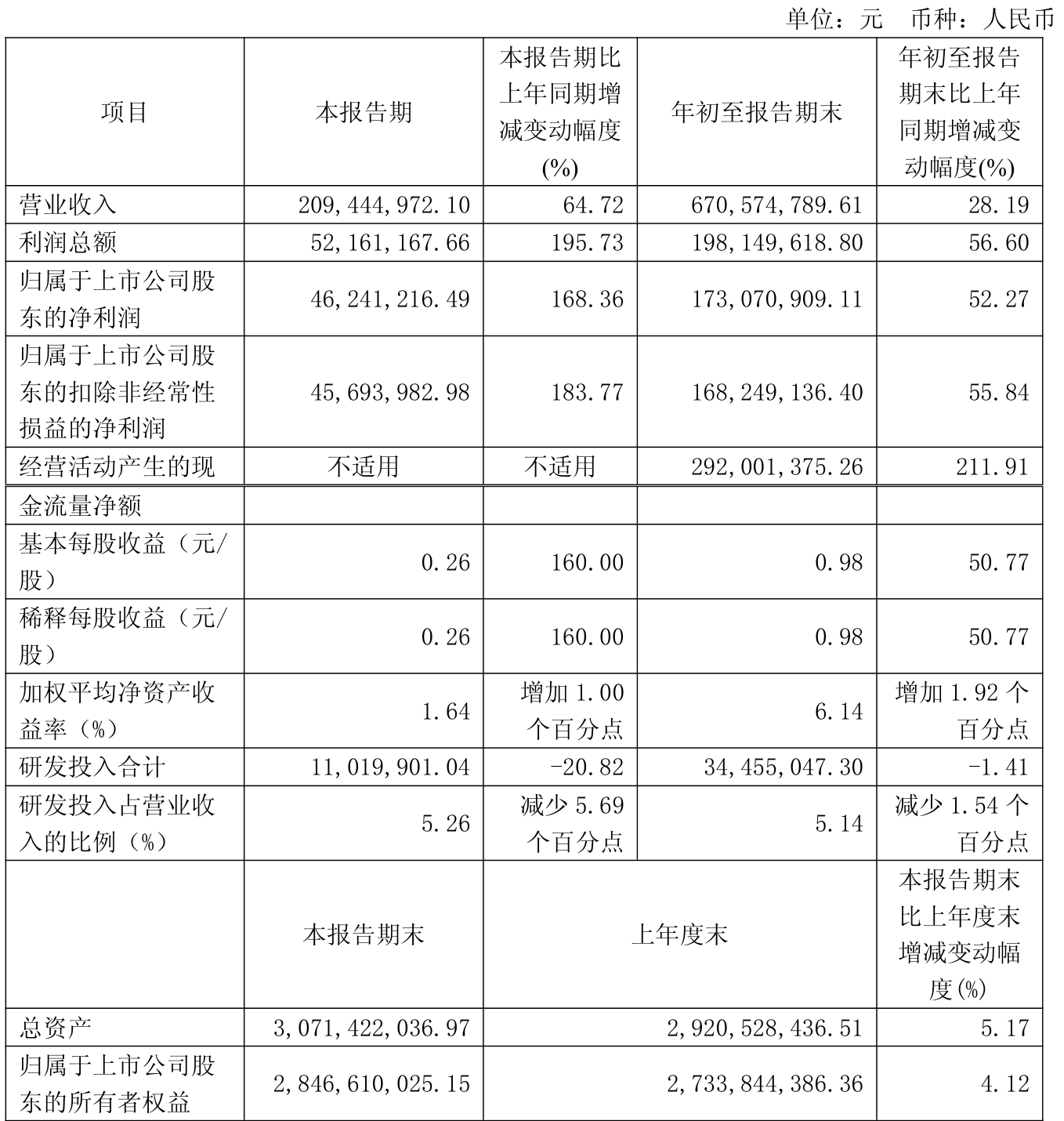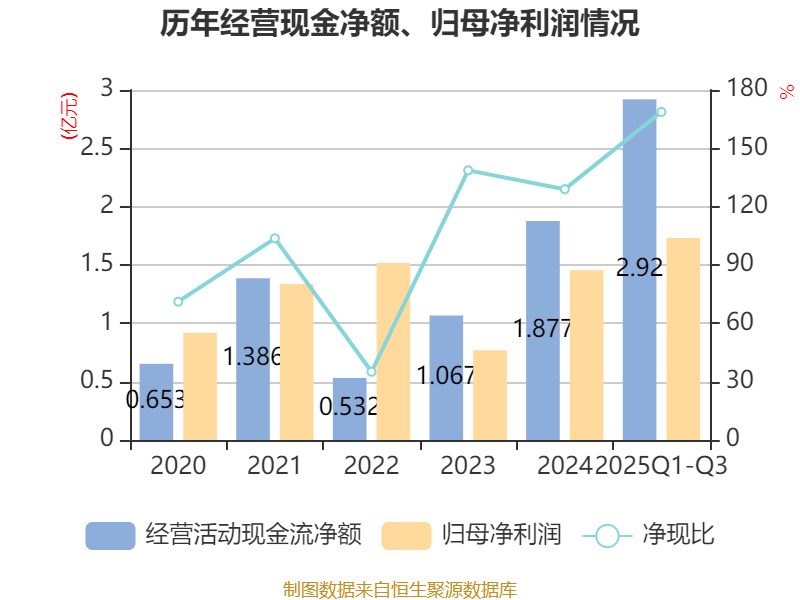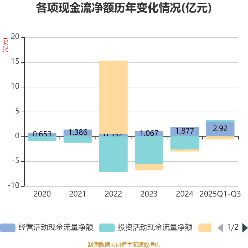 2025年前三季度,公司经营活动现金流净额为2.92亿元,同比增长211.91%;筹资活动现金流净额-6109.72万元,同比减少1957.06万元;投资活动现金流净额3315.42万元,上年同期为-7209.66万元。
