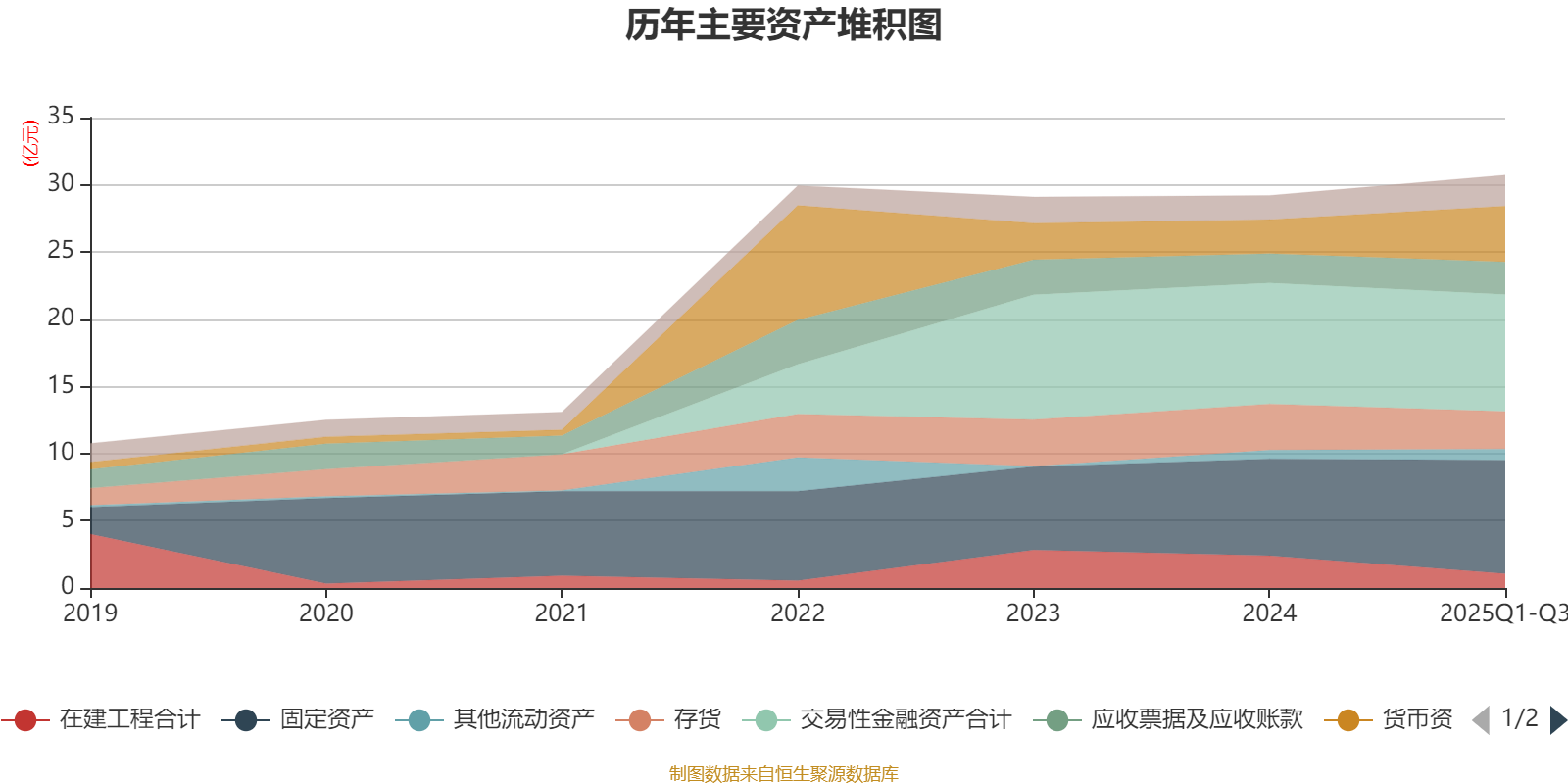 资产重大变化方面,截至2025年三季度末,公司货币资金较上年末增加63.6%,占公司总资产比重上升4.82个百分点;在建工程合计较上年末减少55.6%,占公司总资产比重下降4.75个百分点;固定资产较上年末增加17.1%,占公司总资产比重上升2.8个百分点;存货较上年末减少18.67%,占公司总资产比重下降2.67个百分点。