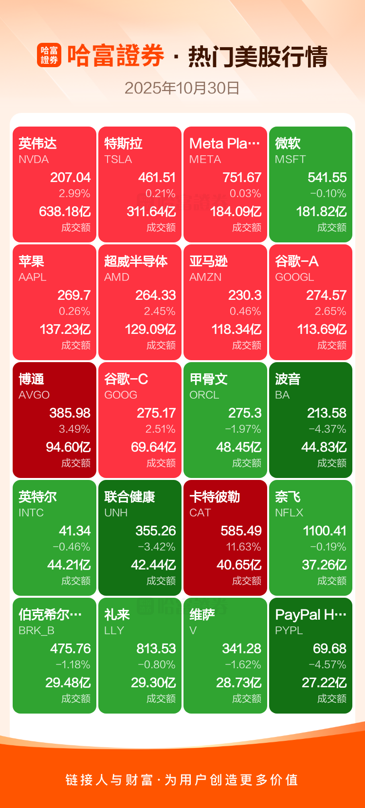 英伟达涨2.99%,特斯拉涨0.21%,Meta Platforms Inc-A涨0.03%,微软跌0.10%,苹果涨0.26%,超威半导体涨2.45%,亚马逊涨0.46%,谷歌-A涨2.65%,博通涨3.49%,谷歌-C涨2.51%。