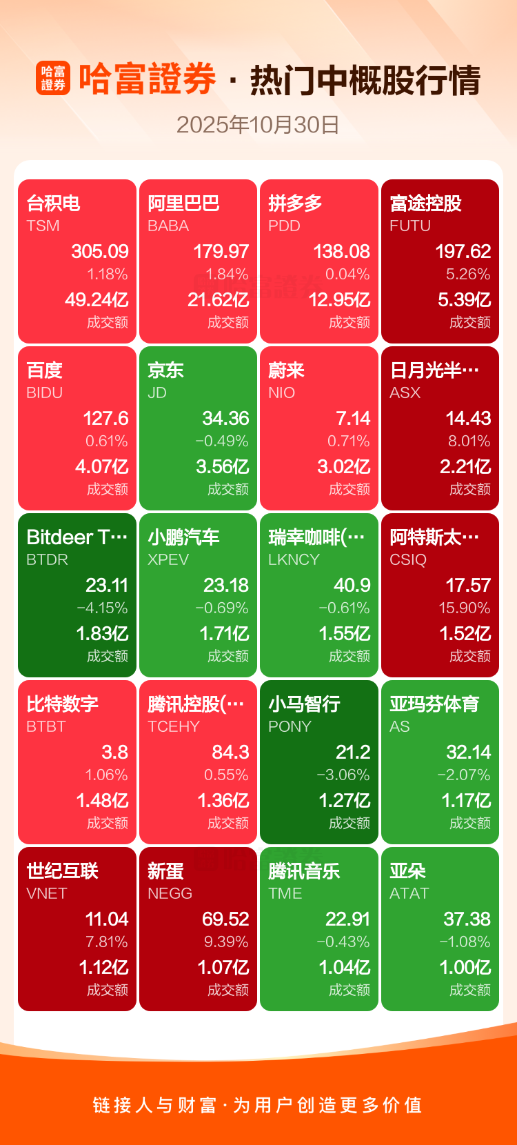 台积电涨1.18%,阿里巴巴涨1.84%,拼多多涨0.04%,富途控股涨5.26%,百度涨0.61%,京东跌0.49%,蔚来涨0.71%,日月光半导体涨8.01%,Bitdeer Technologies Group-A跌4.15%,小鹏汽车跌0.69%。