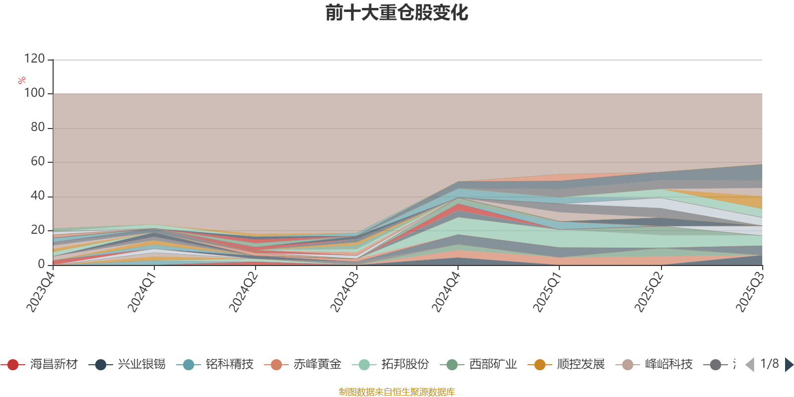 截至2025年三季度末,基金十大重仓股分别是华友钴业、北方稀土、紫金矿业、中金黄金、兴业银锡、洛阳钼业、西部黄金、山金国际、华钰矿业、山东黄金。