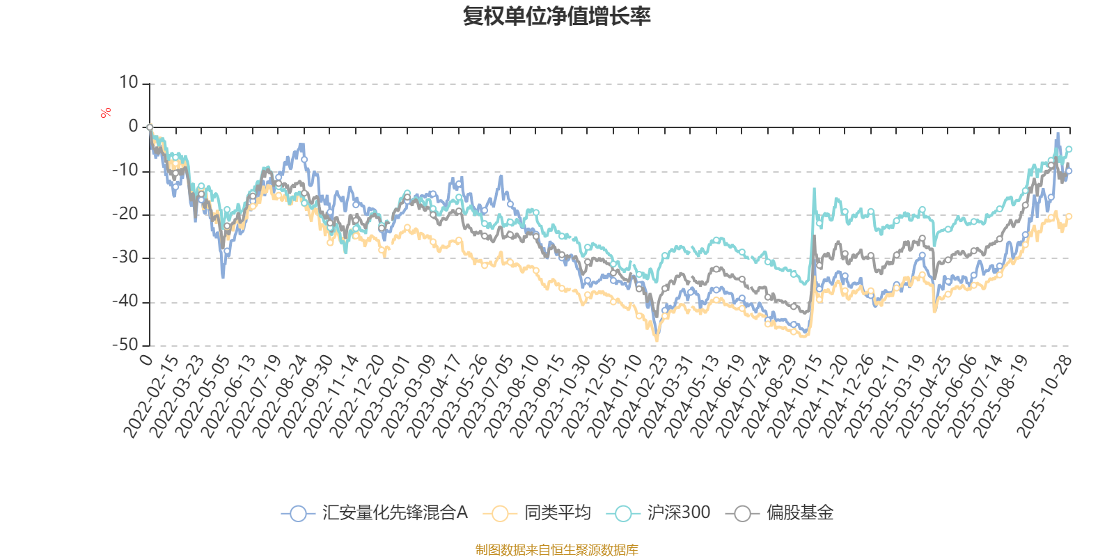 截至10月28日,汇安量化先锋混合A近三个月复权单位净值增长率为22.05%,位于同类可比基金152/689;近半年复权单位净值增长率为41.06%,位于同类可比基金148/688;近一年复权单位净值增长率为36.88%,位于同类可比基金180/653;近三年复权单位净值增长率为11.64%,位于同类可比基金205/364。