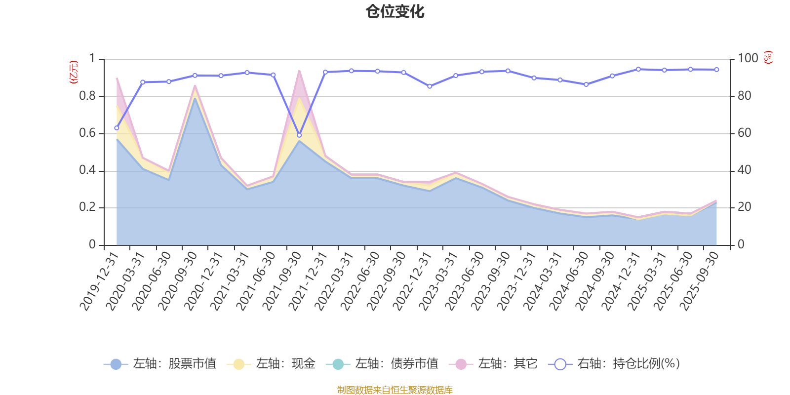 据定期报告数据统计,近三年平均股票仓位为91.49%,同类平均为83.73%。2024年末基金达到94.65%的最高仓位,2021年三季度末最低,为59.15%。