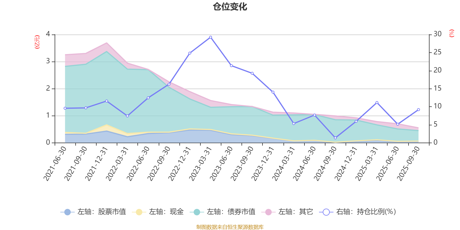 据定期报告数据统计,近三年平均股票仓位为12.87%,同类平均为19.14%。2023年一季度末基金达到29.25%的最高仓位,2024年三季度末最低,为1.35%。