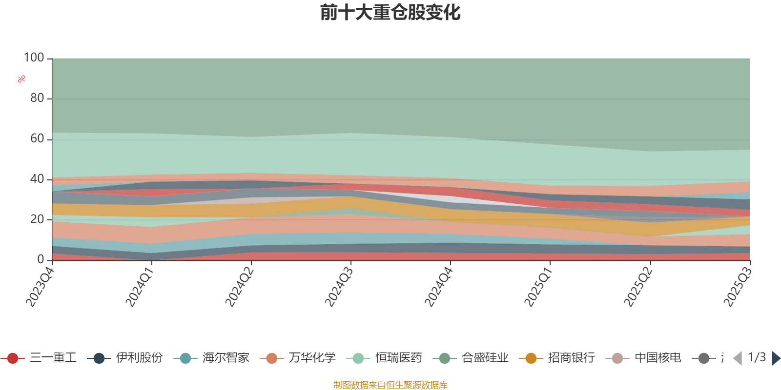 该基金持股集中度较高,且持股标的较为稳定。截至2025年三季度末,基金十大重仓股分别是贵州茅台、万华化学、中国平安、紫金矿业、恒瑞医药、招商银行、药明康德、三一重工、中国中免、伊利股份。