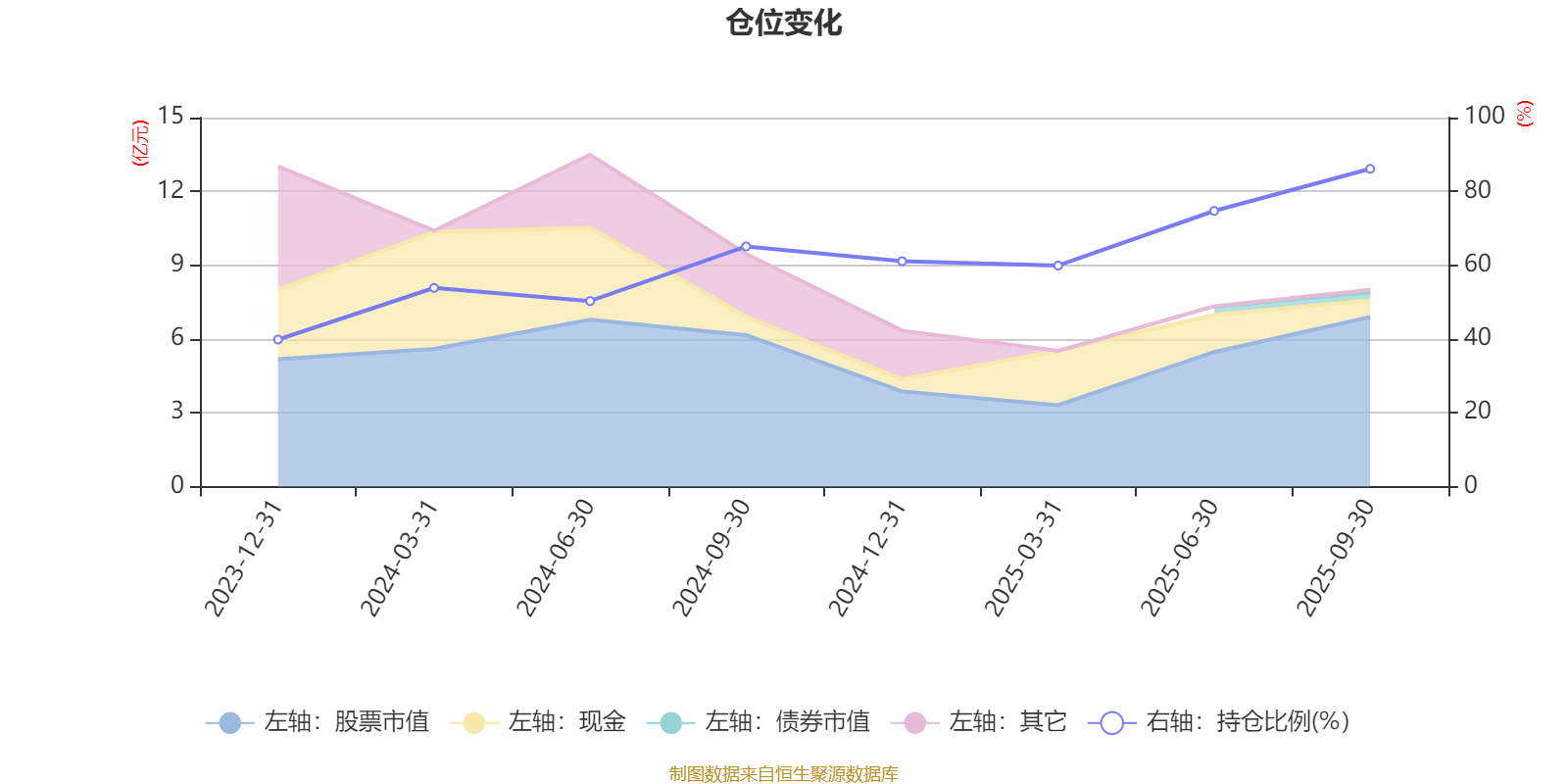据定期报告数据统计,成立以来平均股票仓位为61.36%,同类平均为85.66%。2025年三季度末基金达到86.12%的最高仓位,2023年末最低,为39.84%。