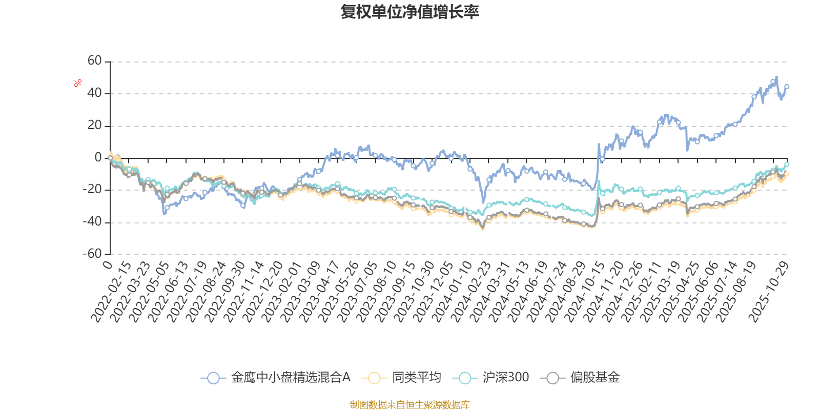 截至10月29日,金鹰中小盘精选混合A近三个月复权单位净值增长率为13.54%,位于同类可比基金150/265;近半年复权单位净值增长率为30.79%,位于同类可比基金124/265;近一年复权单位净值增长率为34.91%,位于同类可比基金98/265;近三年复权单位净值增长率为88.40%,位于同类可比基金5/253。