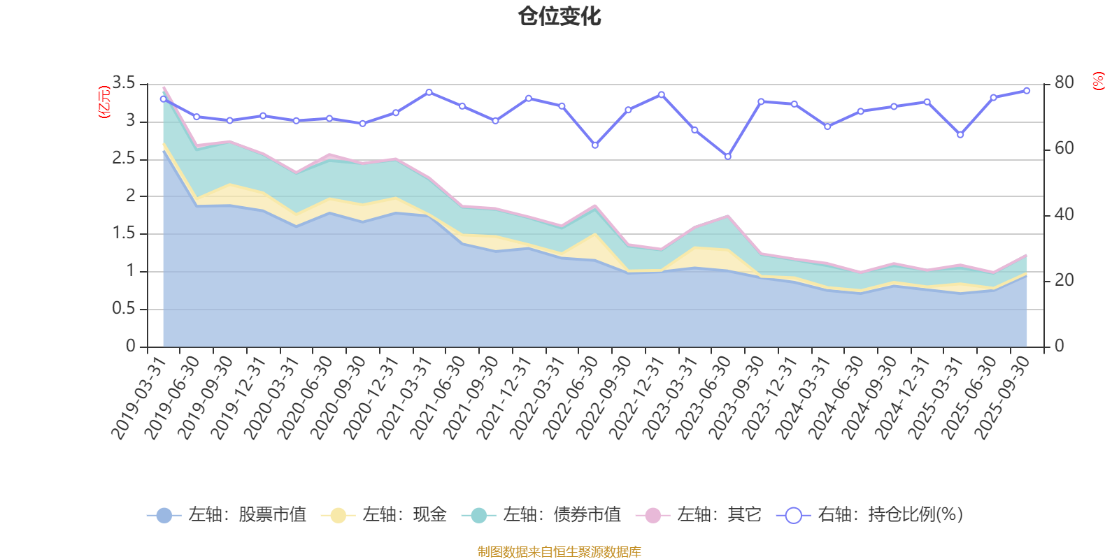 据定期报告数据统计,近三年平均股票仓位为71.14%,同类平均为72.35%。2025年三季度末基金达到77.92%的最高仓位,2023年上半年末最低,为57.9%。