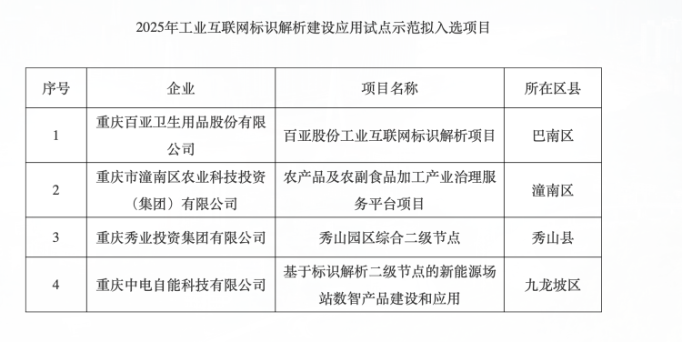 4个项目入选!重庆2025年工业互联网标识解析建设应用试点示范拟入选项目公示