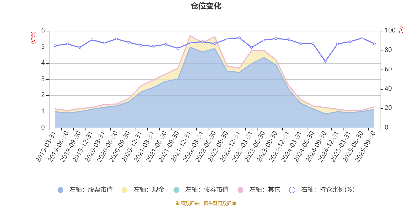 据定期报告数据统计,近三年平均股票仓位为87.22%,同类平均为83.66%。2022年末基金达到92.94%的最高仓位,2024年三季度末最低,为68.59%。