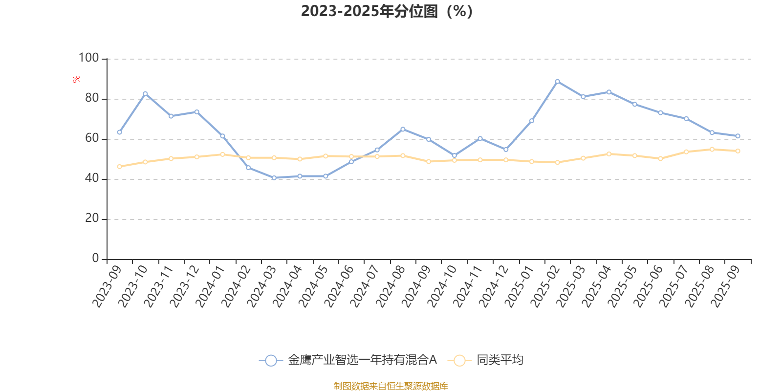 通过所选区间该基金净值增长率分位图,可以观察该基金与同类基金业绩比较情况。图为坐标原点到区间内某时点的净值增长率在同类基金中的分位数。