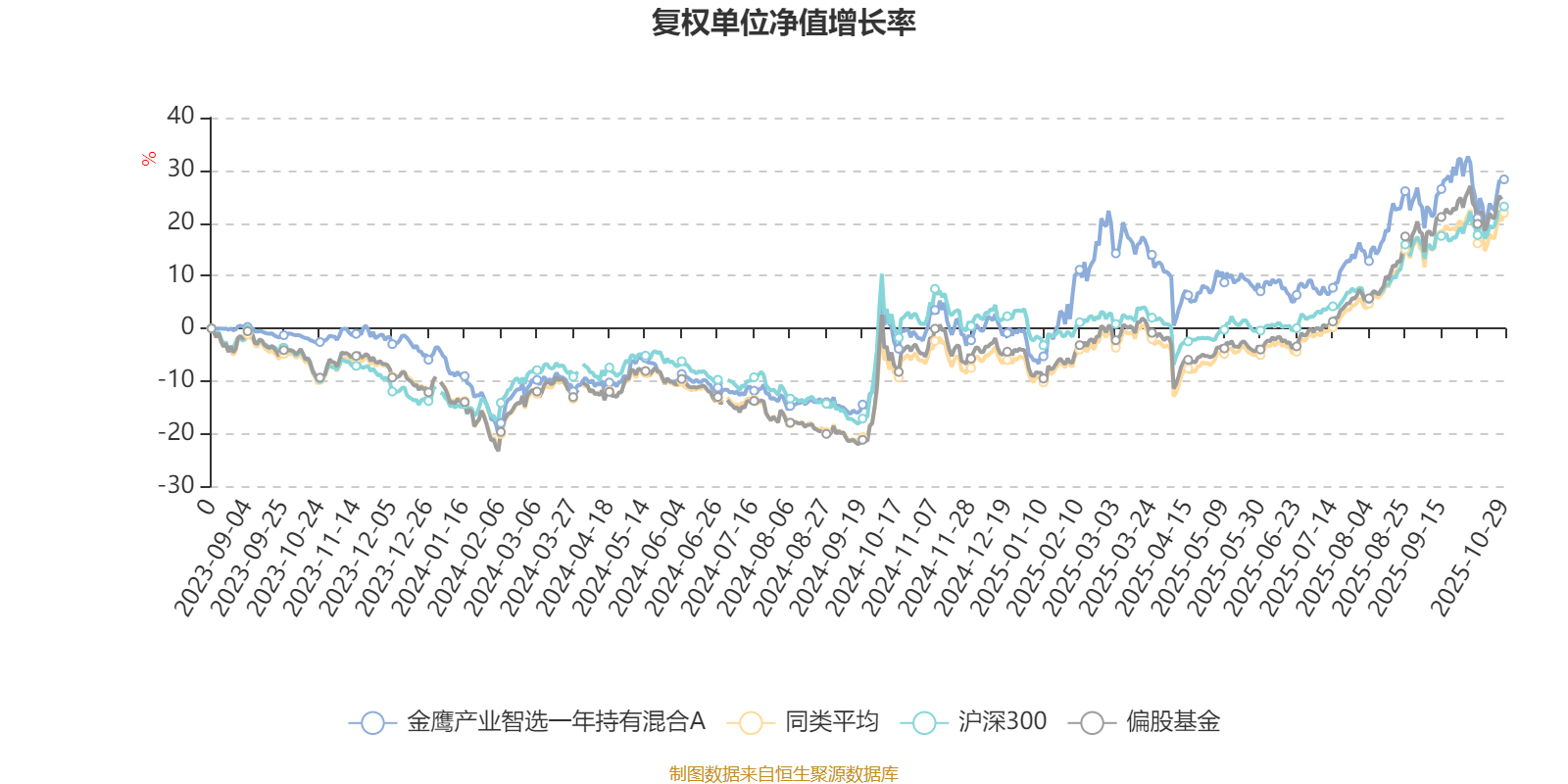 截至10月29日,金鹰产业智选一年持有混合A近三个月复权单位净值增长率为10.34%,位于同类可比基金434/689;近半年复权单位净值增长率为19.68%,位于同类可比基金503/688;近一年复权单位净值增长率为30.68%,位于同类可比基金290/657。