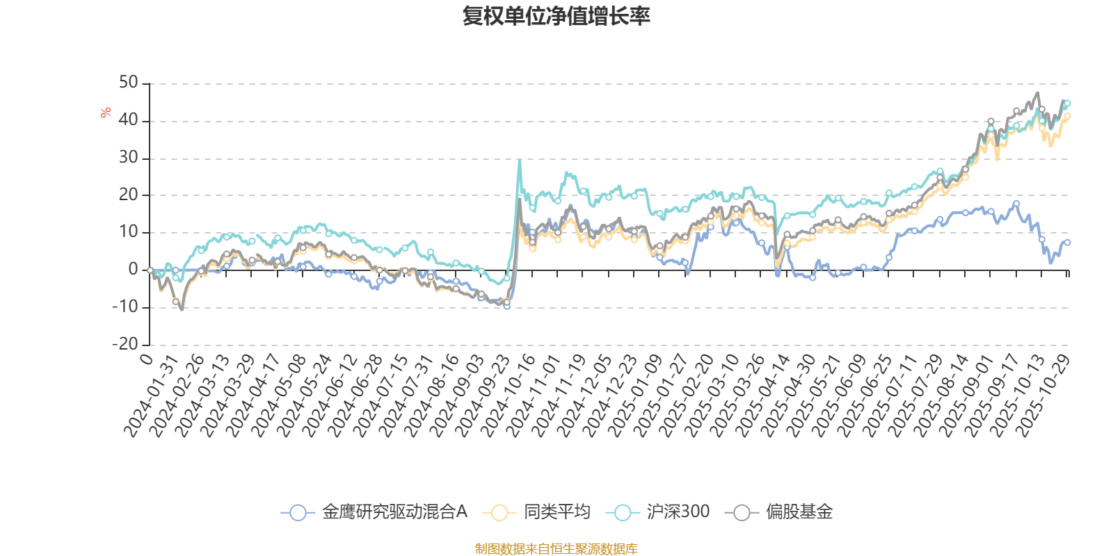 截至10月29日,金鹰研究驱动混合A近三个月复权单位净值增长率为-5.42%,位于同类可比基金685/689;近半年复权单位净值增长率为9.73%,位于同类可比基金634/688;近一年复权单位净值增长率为-3.17%,位于同类可比基金647/657。