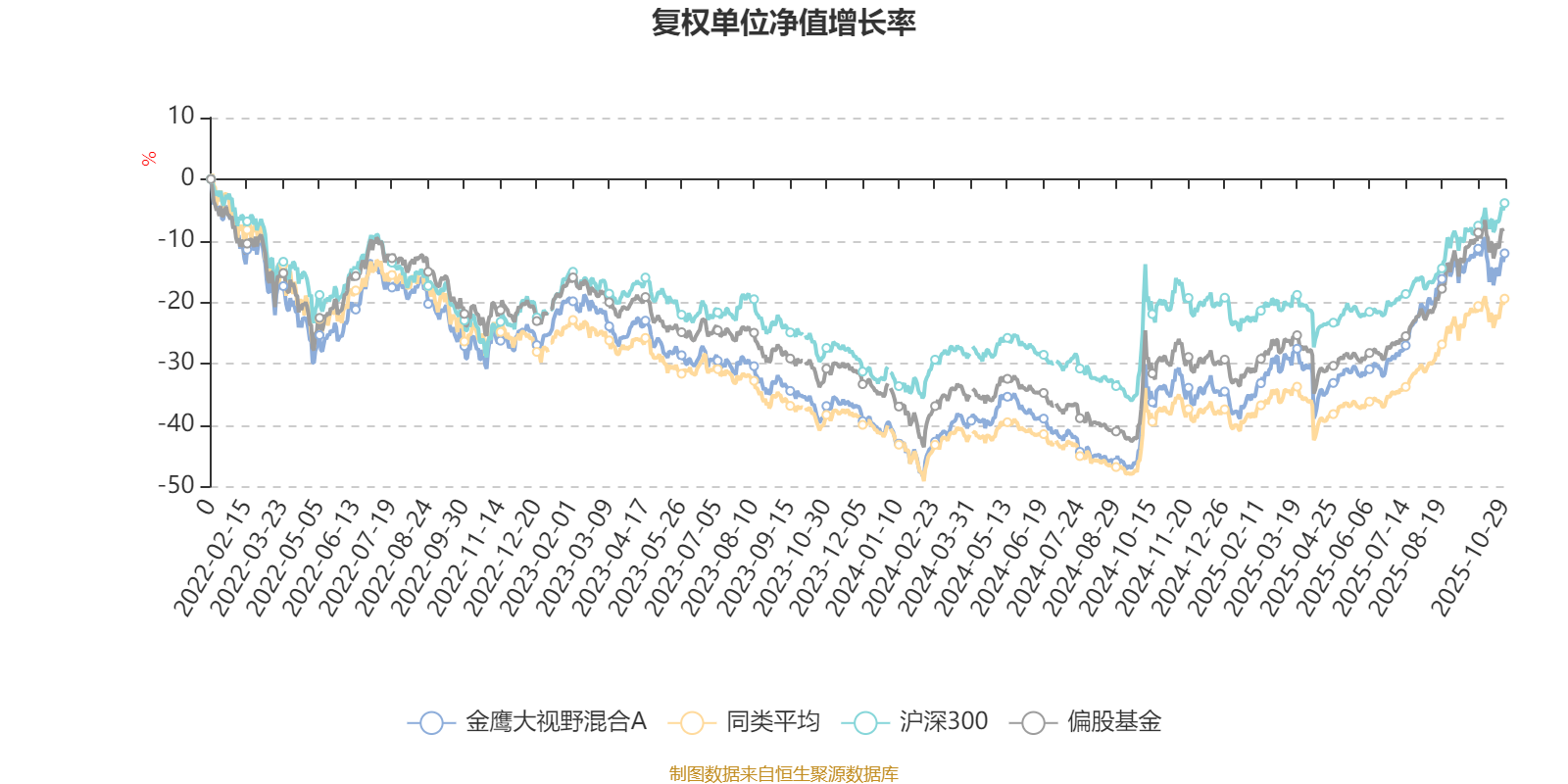 截至10月29日,金鹰大视野混合A近三个月复权单位净值增长率为10.25%,位于同类可比基金440/689;近半年复权单位净值增长率为31.66%,位于同类可比基金287/688;近一年复权单位净值增长率为33.83%,位于同类可比基金254/657;近三年复权单位净值增长率为26.12%,位于同类可比基金139/364。