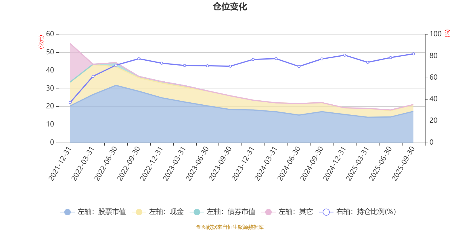 据定期报告数据统计,近三年平均股票仓位为75.45%,同类平均为85.96%。2025年三季度末基金达到82.16%的最高仓位,2021年末最低,为37.17%。