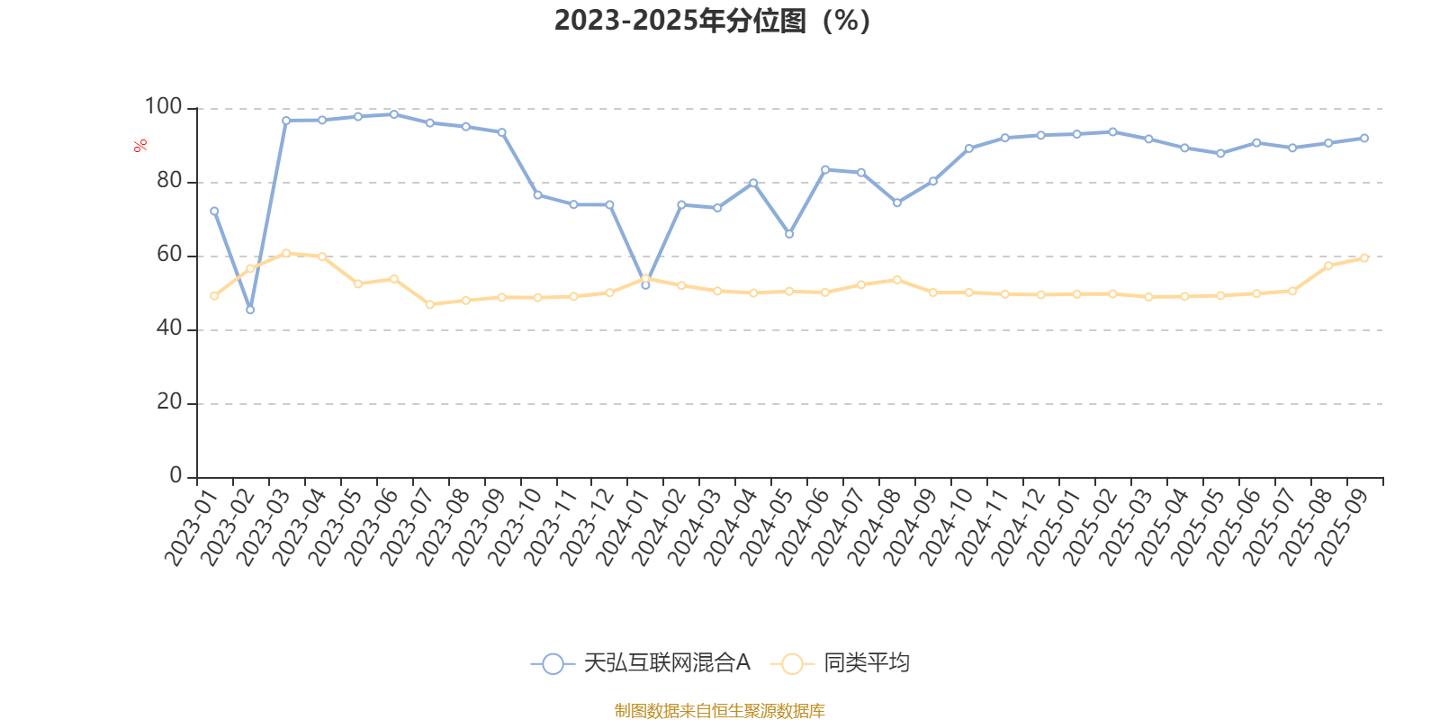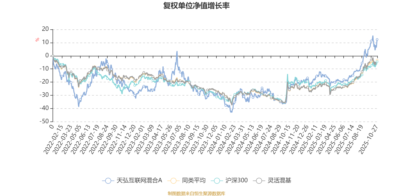 截至10月27日,天弘互联网混合A近三个月复权单位净值增长率为27.08%,位于同类可比基金231/1287;近半年复权单位净值增长率为40.68%,位于同类可比基金265/1287;近一年复权单位净值增长率为43.16%,位于同类可比基金227/1287;近三年复权单位净值增长率为42.76%,位于同类可比基金180/1286。