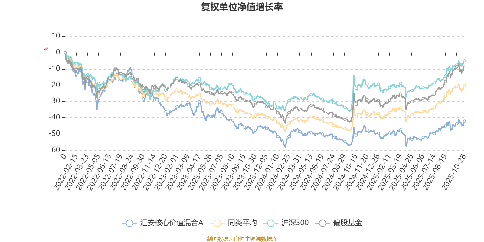 截至10月28日,汇安核心价值混合A近三个月复权单位净值增长率为9.54%,位于同类可比基金445/689;近半年复权单位净值增长率为24.43%,位于同类可比基金392/688;近一年复权单位净值增长率为12.60%,位于同类可比基金526/653;近三年复权单位净值增长率为-19.29%,位于同类可比基金336/364。