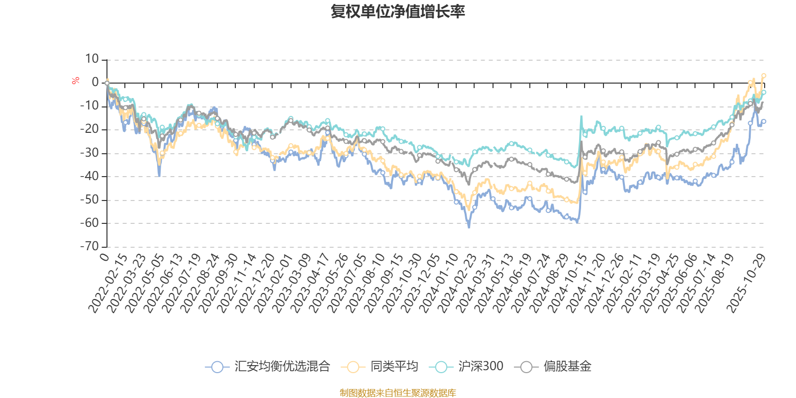 截至10月29日,汇安均衡优选混合近三个月复权单位净值增长率为27.82%,位于同类可比基金154/229;近半年复权单位净值增长率为41.37%,位于同类可比基金165/229;近一年复权单位净值增长率为46.45%,位于同类可比基金149/213;近三年复权单位净值增长率为4.59%,位于同类可比基金152/158。