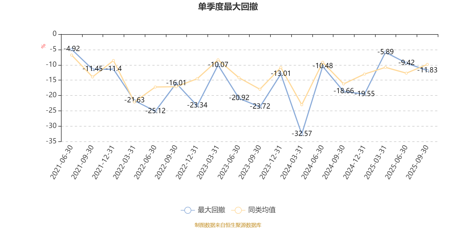 截至10月28日,基金近三年最大回撤为53.09%,同类可比基金排名141/159。单季度最大回撤出现在2024年一季度,为32.57%。