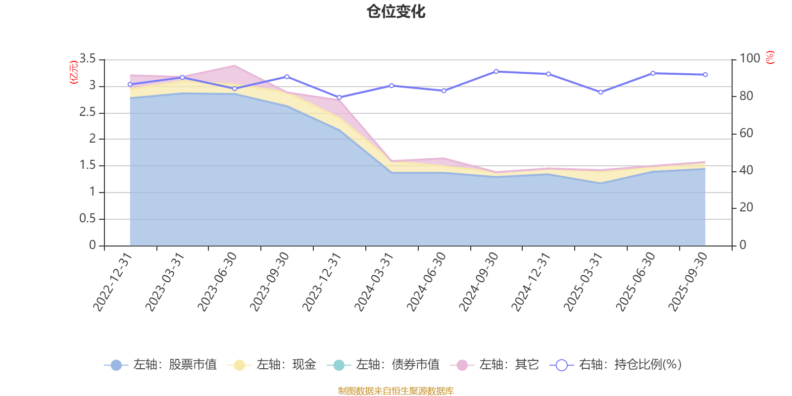 据定期报告数据统计,近三年平均股票仓位为87.77%,同类平均为85.66%。2024年三季度末基金达到93.51%的最高仓位,2023年末最低,为79.6%。