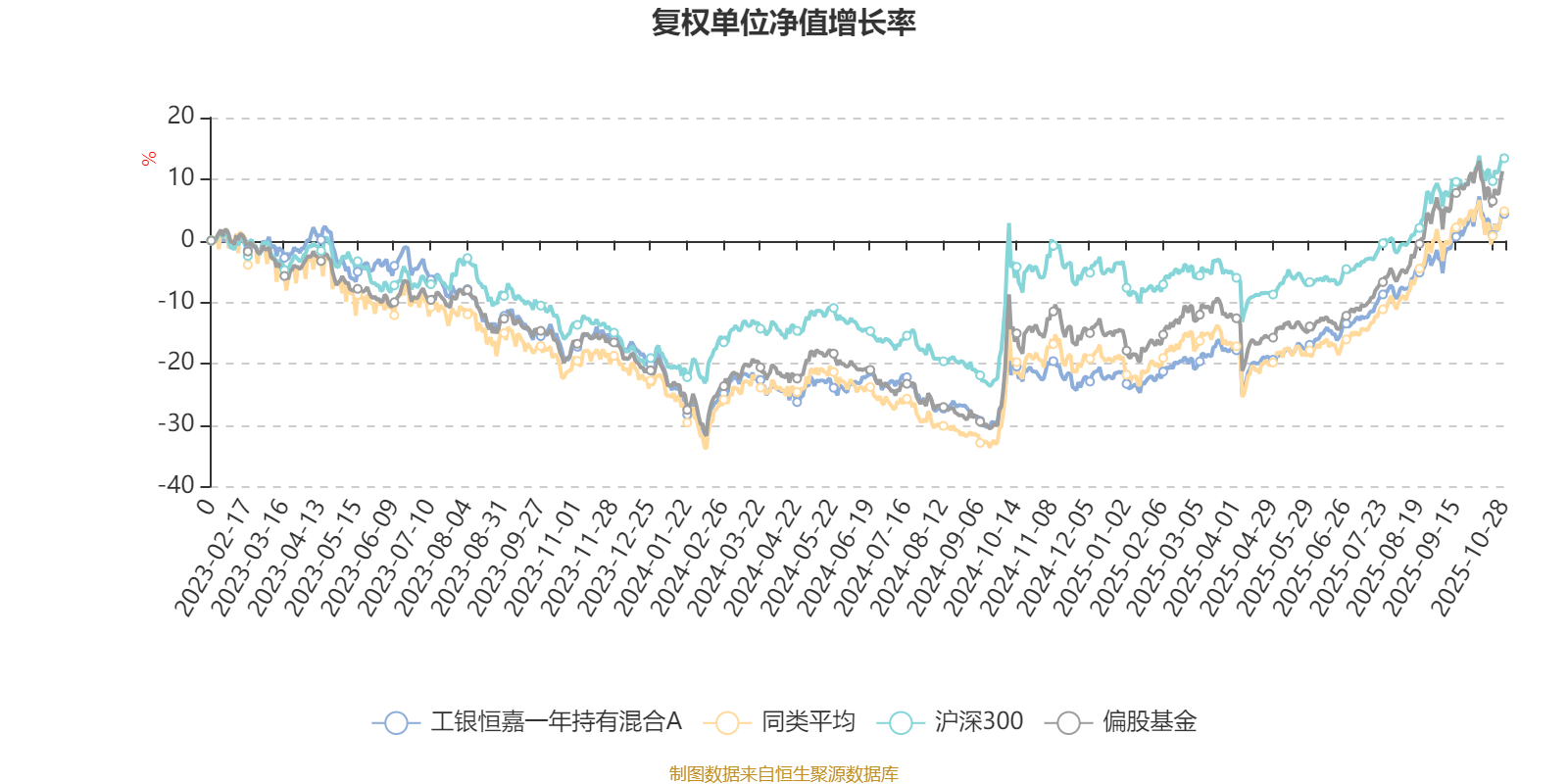 截至10月28日,工银恒嘉一年持有混合A近三个月复权单位净值增长率为13.17%,位于同类可比基金327/621;近半年复权单位净值增长率为29.28%,位于同类可比基金305/619;近一年复权单位净值增长率为32.58%,位于同类可比基金247/611。