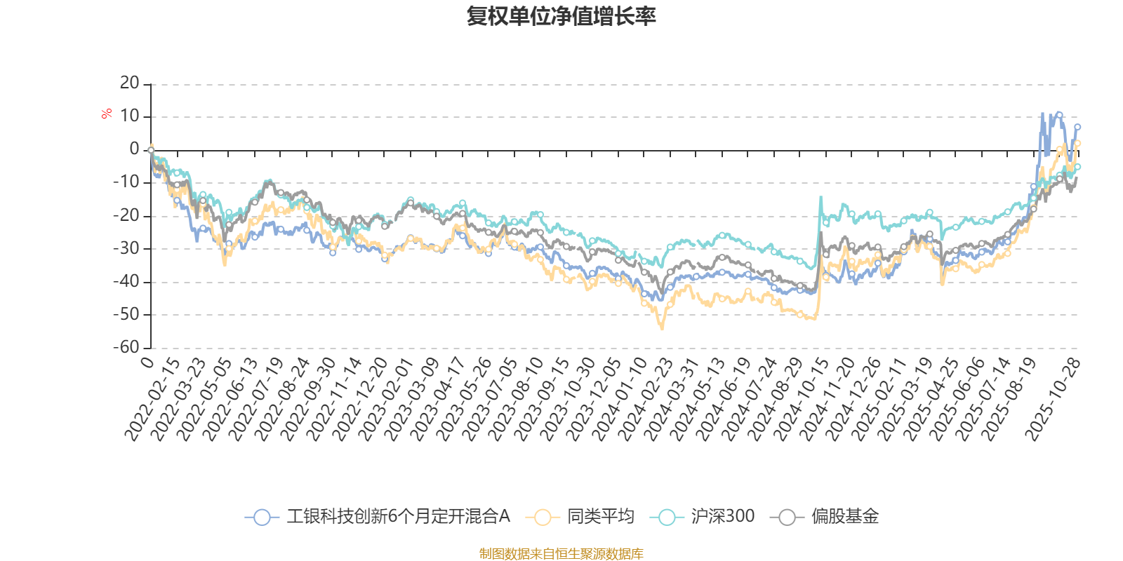 截至10月28日,工银科技创新6个月定开混合A近三个月复权单位净值增长率为39.39%,位于同类可比基金101/229;近半年复权单位净值增长率为59.55%,位于同类可比基金97/229;近一年复权单位净值增长率为74.42%,位于同类可比基金47/213;近三年复权单位净值增长率为47.13%,位于同类可比基金81/158。