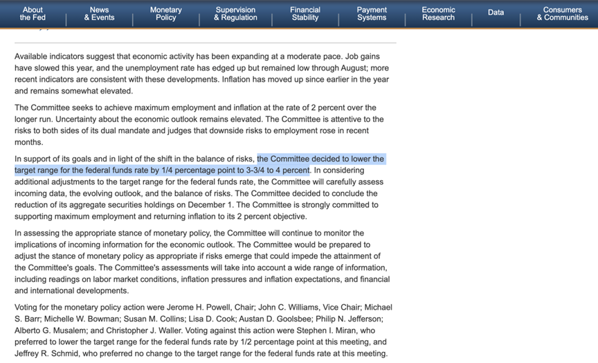 美联储如期降息并宣布停止缩表