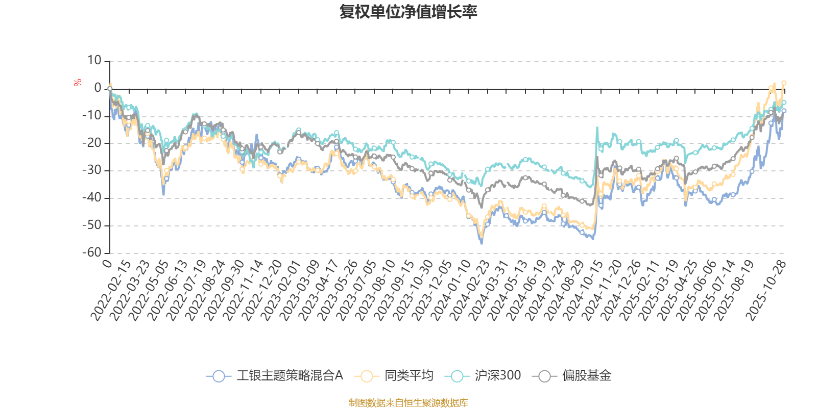 截至10月28日,工银主题策略混合A近三个月复权单位净值增长率为40.29%,位于同类可比基金96/229;近半年复权单位净值增长率为46.47%,位于同类可比基金135/229;近一年复权单位净值增长率为51.88%,位于同类可比基金117/213;近三年复权单位净值增长率为22.13%,位于同类可比基金126/158。