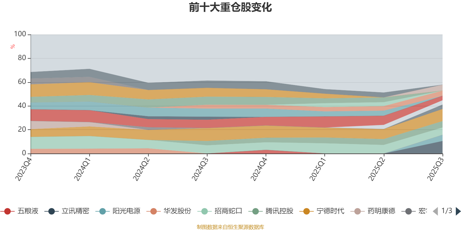 该基金持股集中度较高。截至2025年三季度末,基金十大重仓股分别是立讯精密、宁德时代、招商蛇口、腾讯控股、阳光电源、快手-W、恒瑞医药、保利发展、科伦博泰生物-B、信达生物。