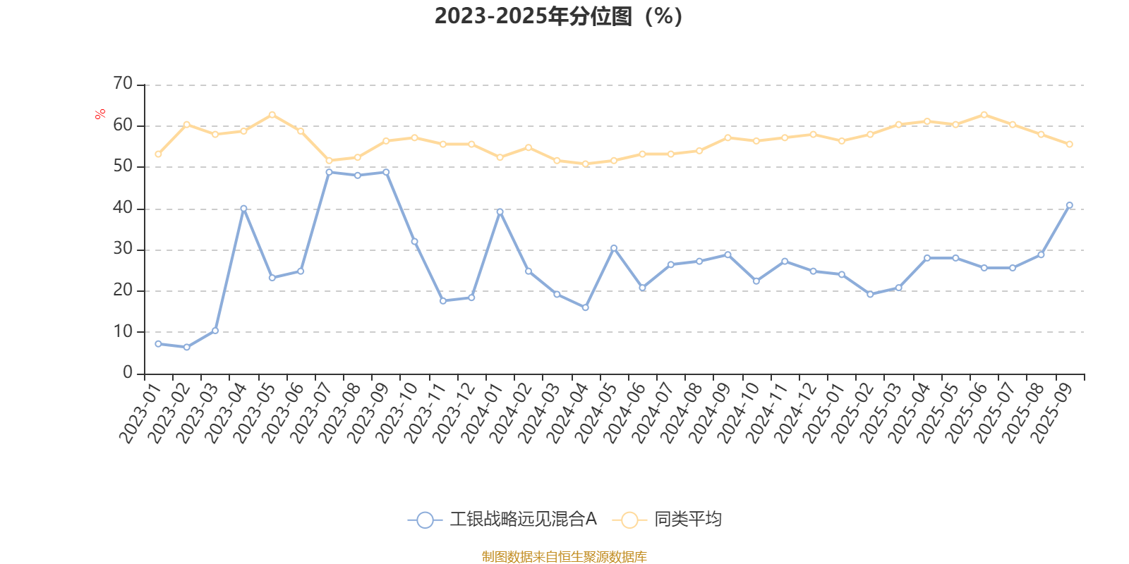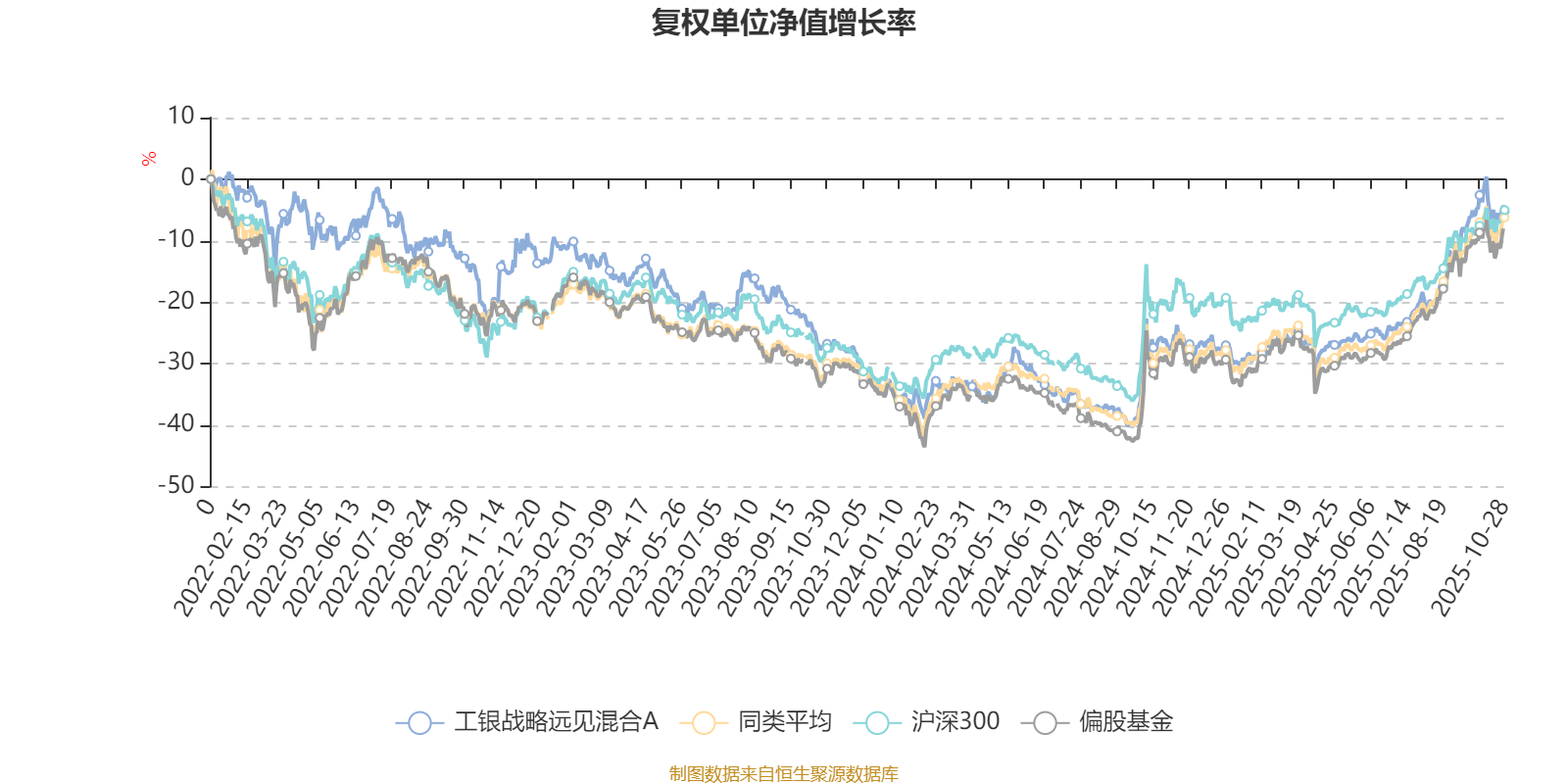 截至10月28日,工银战略远见混合A近三个月复权单位净值增长率为17.40%,位于同类可比基金57/130;近半年复权单位净值增长率为30.53%,位于同类可比基金60/130;近一年复权单位净值增长率为28.34%,位于同类可比基金66/130;近三年复权单位净值增长率为21.45%,位于同类可比基金71/124。