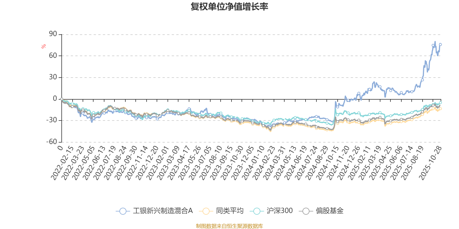 截至10月28日,工银新兴制造混合A近三个月复权单位净值增长率为48.75%,位于同类可比基金6/185;近半年复权单位净值增长率为56.40%,位于同类可比基金15/185;近一年复权单位净值增长率为93.33%,位于同类可比基金4/181;近三年复权单位净值增长率为143.95%,位于同类可比基金1/175。
