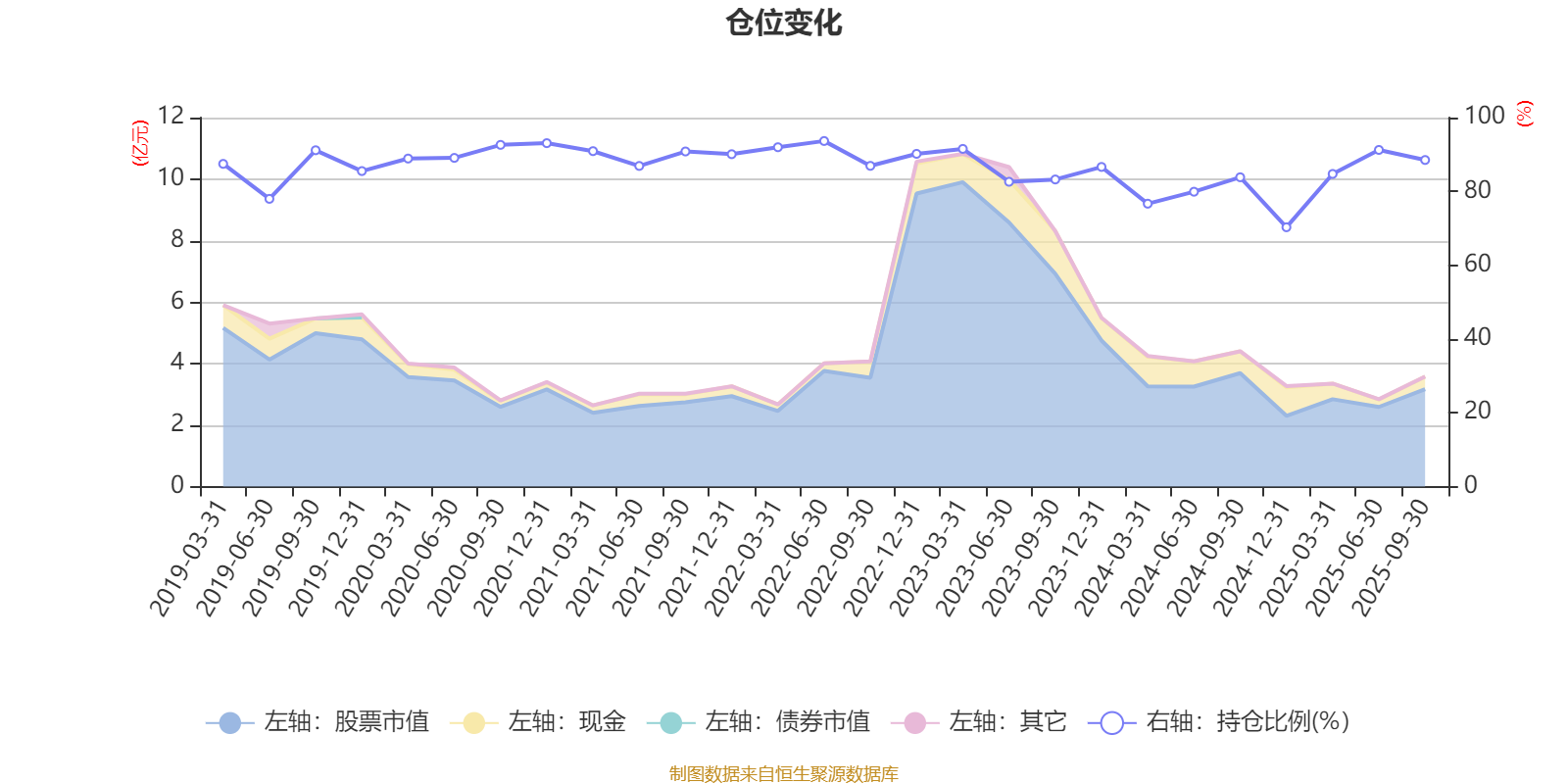 据定期报告数据统计,近三年平均股票仓位为84.11%,同类平均为72.35%。2022年上半年末基金达到93.66%的最高仓位,2024年末最低,为70.28%。