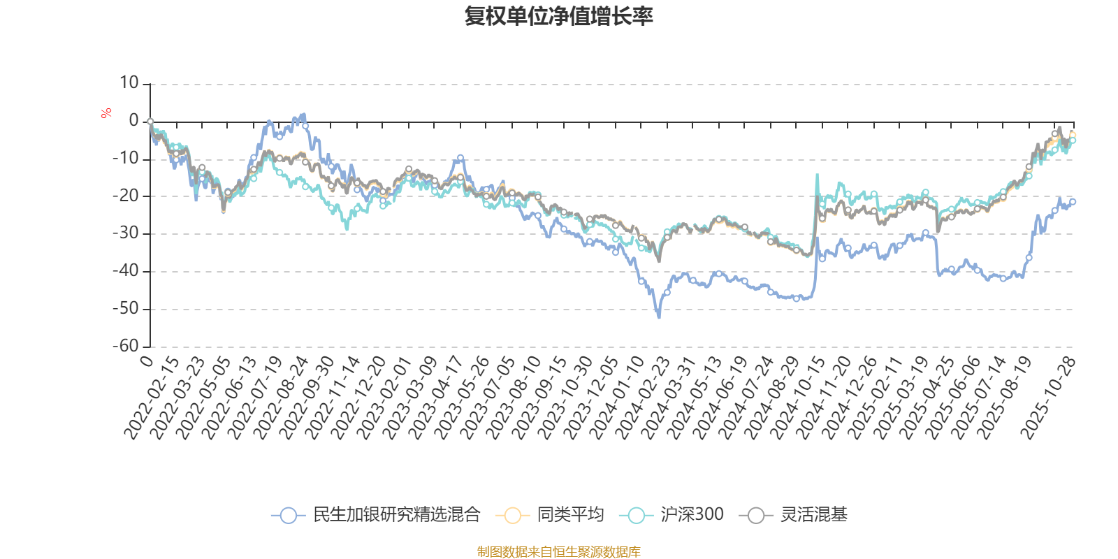 截至10月28日,民生加银研究精选混合近三个月复权单位净值增长率为31.77%,位于同类可比基金152/1287;近半年复权单位净值增长率为31.90%,位于同类可比基金435/1287;近一年复权单位净值增长率为20.89%,位于同类可比基金658/1287;近三年复权单位净值增长率为-4.68%,位于同类可比基金1091/1286。