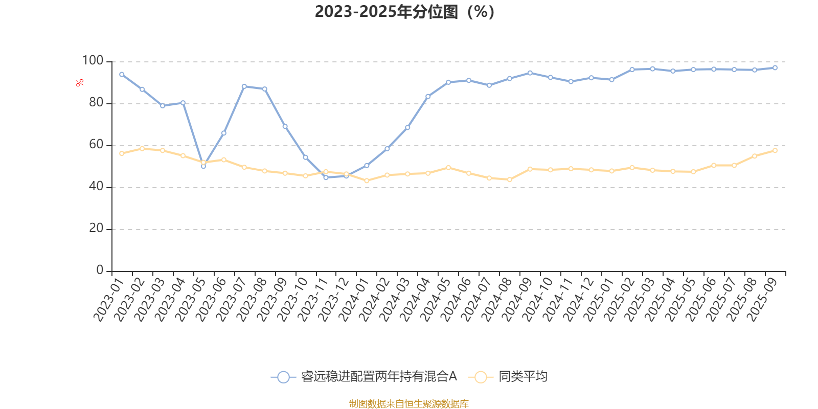 通过所选区间该基金净值增长率分位图,可以观察该基金与同类基金业绩比较情况。图为坐标原点到区间内某时点的净值增长率在同类基金中的分位数。