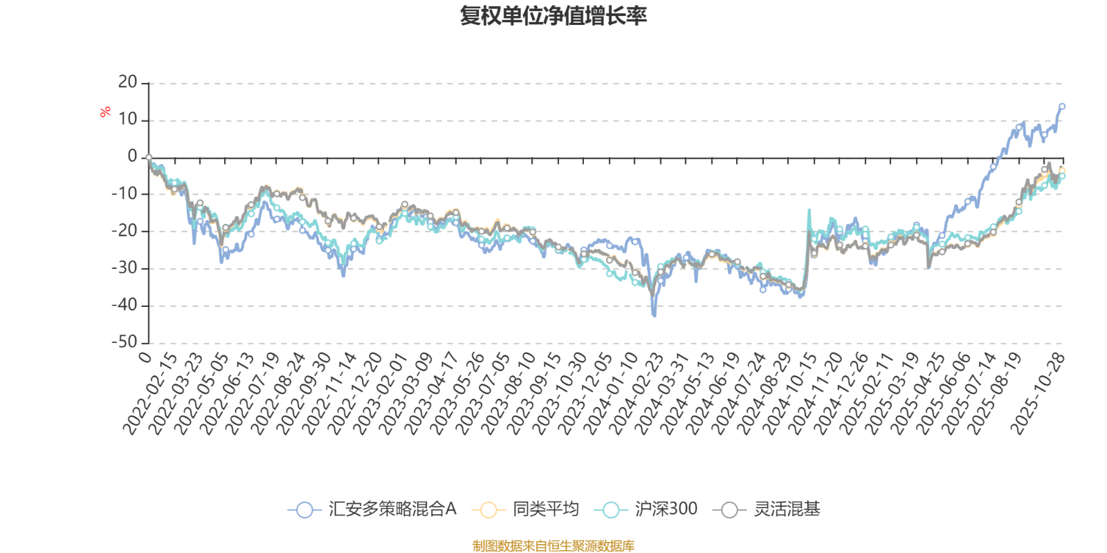 截至10月28日,汇安多策略混合A近三个月复权单位净值增长率为11.04%,位于同类可比基金664/1287;近半年复权单位净值增长率为45.03%,位于同类可比基金203/1287;近一年复权单位净值增长率为42.94%,位于同类可比基金218/1287;近三年复权单位净值增长率为66.69%,位于同类可比基金79/1286。
