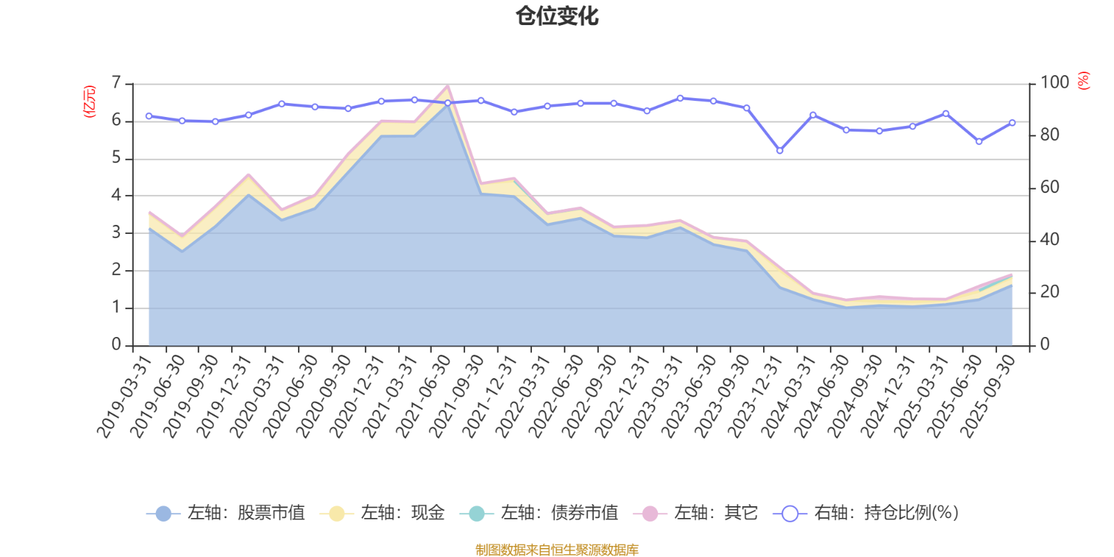 据定期报告数据统计,近三年平均股票仓位为85.82%,同类平均为72.35%。2023年一季度末基金达到94.42%的最高仓位,2023年末最低,为74.42%。
