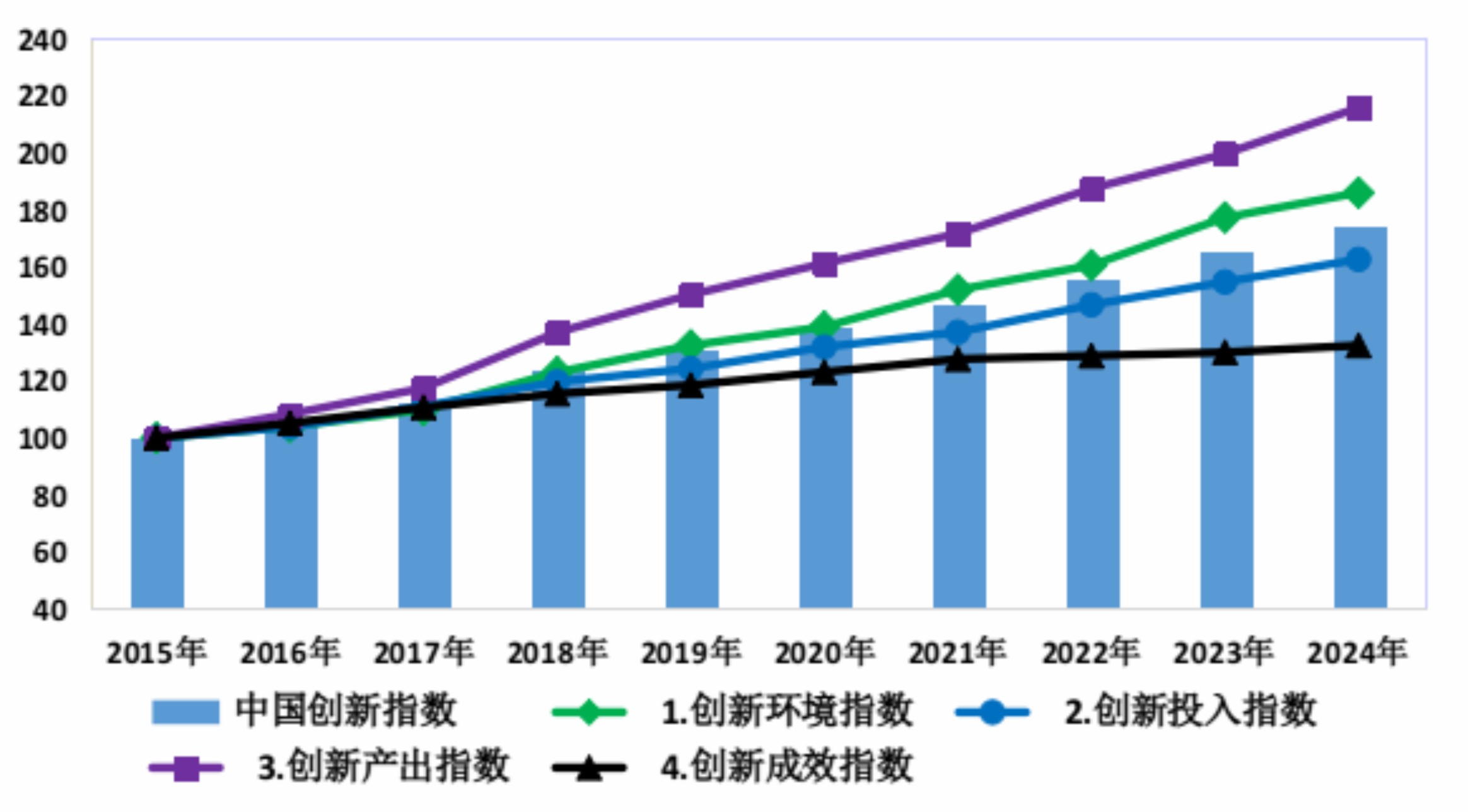 2015—2024年中国创新指数及分领域指数 (2015年=100)