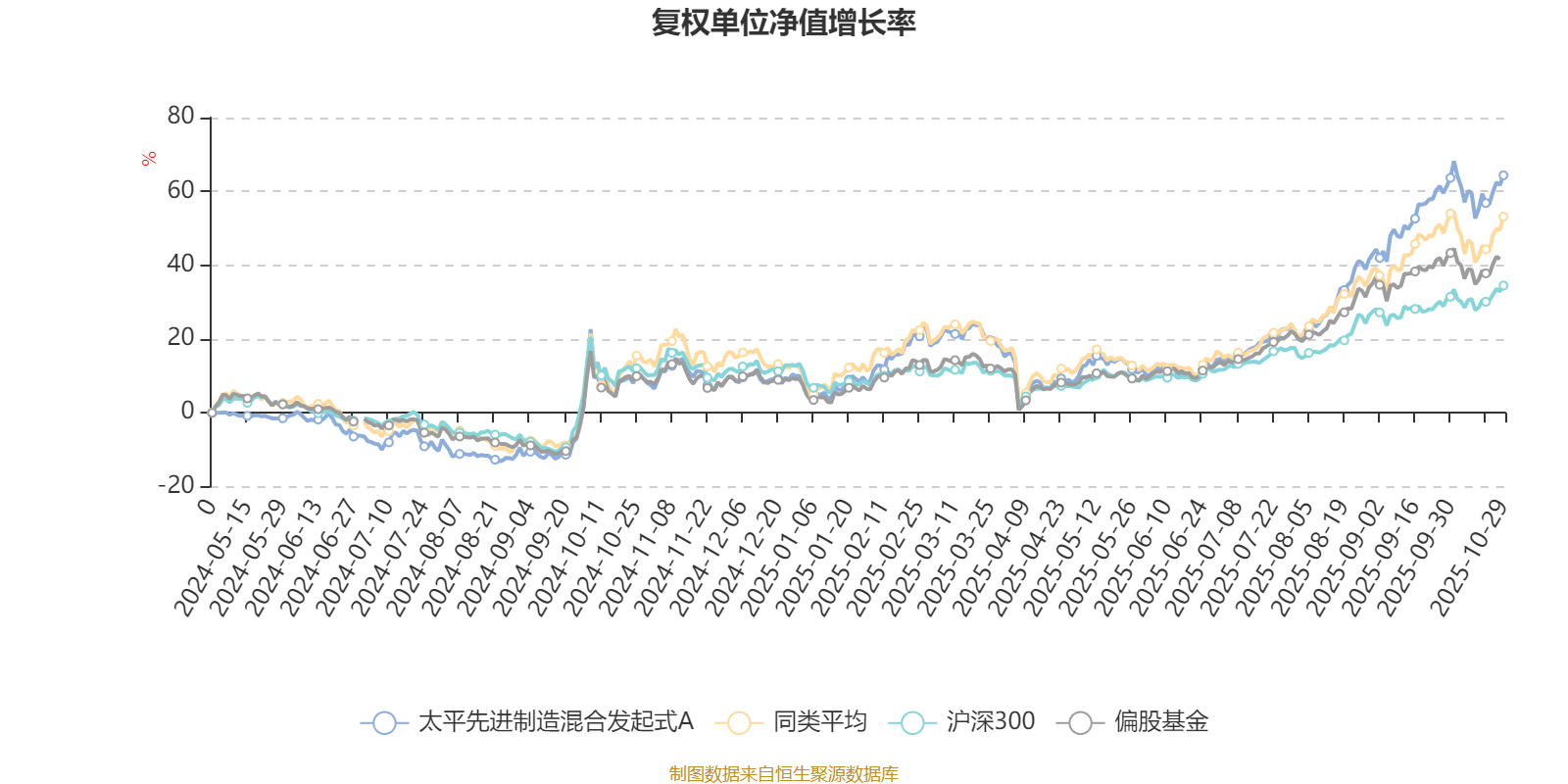 截至10月29日,太平先进制造混合发起式A近三个月复权单位净值增长率为32.85%,位于同类可比基金24/100;近半年复权单位净值增长率为51.25%,位于同类可比基金13/99;近一年复权单位净值增长率为50.51%,位于同类可比基金15/90。
