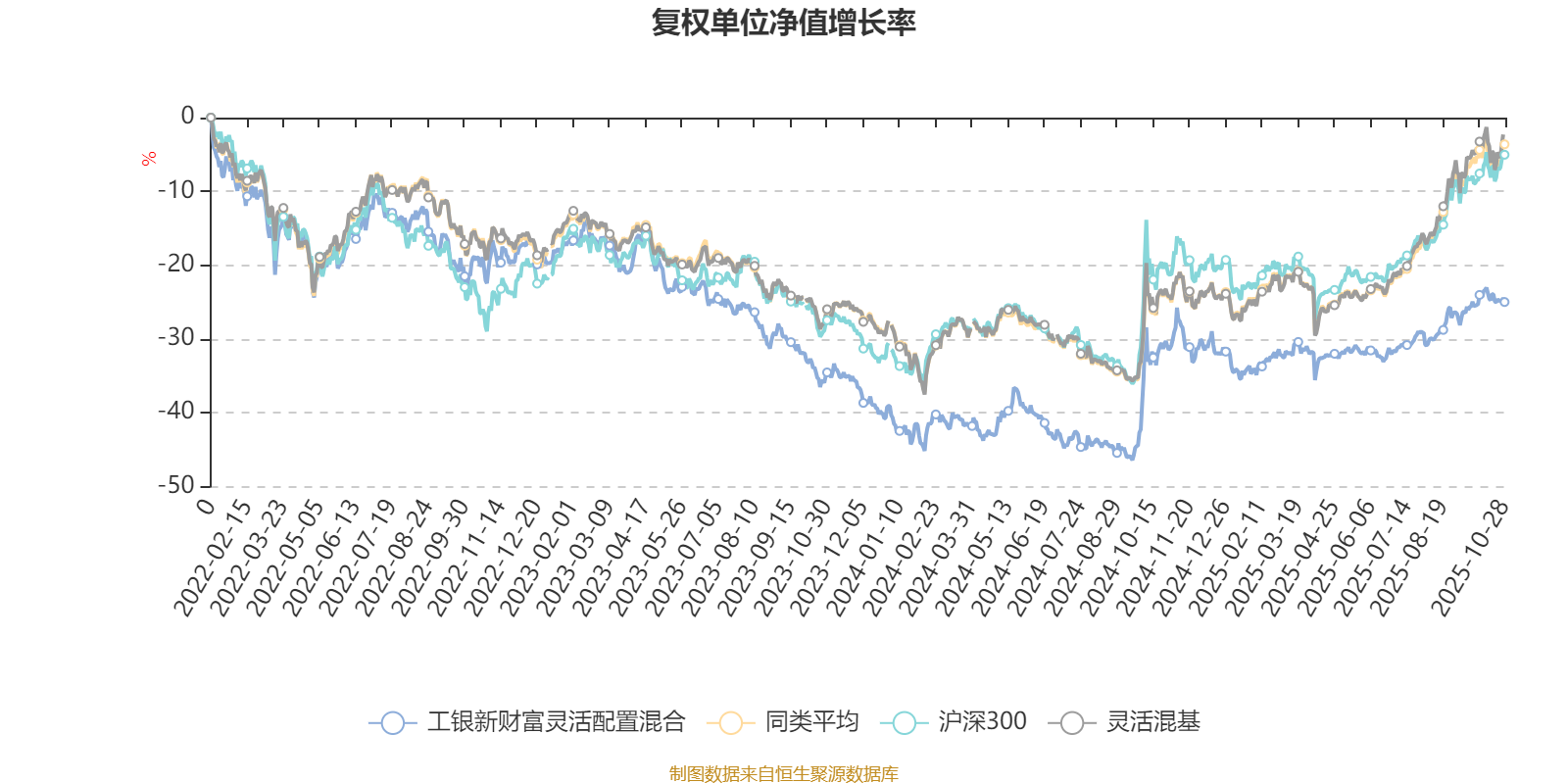 截至10月28日,工银新财富灵活配置混合近三个月复权单位净值增长率为5.59%,位于同类可比基金888/1287;近半年复权单位净值增长率为11.14%,位于同类可比基金997/1287;近一年复权单位净值增长率为7.62%,位于同类可比基金1017/1287;近三年复权单位净值增长率为-3.78%,位于同类可比基金1075/1286。