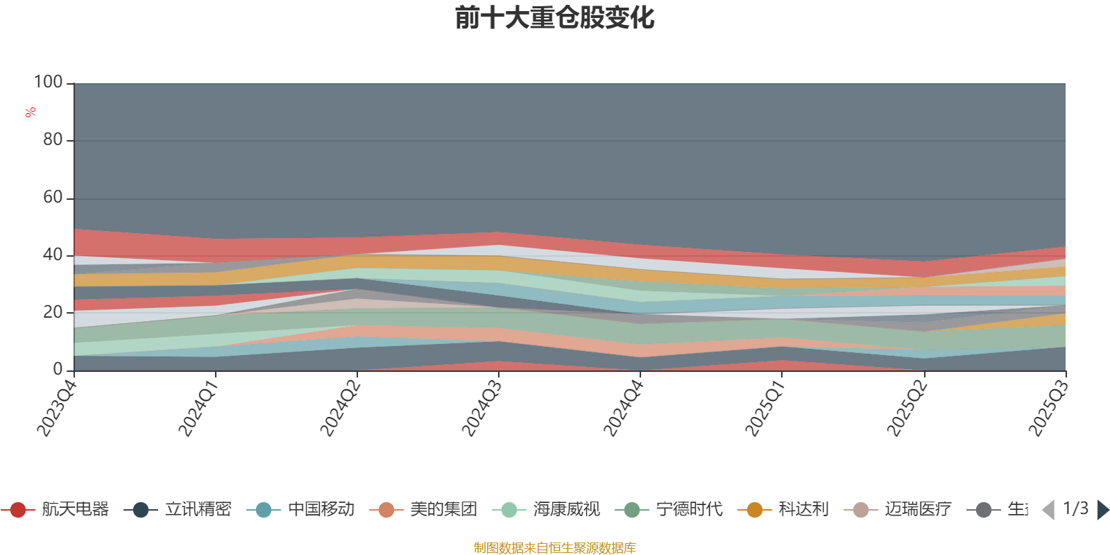 截至2025年三季度末,基金十大重仓股分别是立讯精密、宁德时代、七一二、科达利、恒瑞医药、沪电股份、思源电气、恺英网络、生益科技、工业富联。