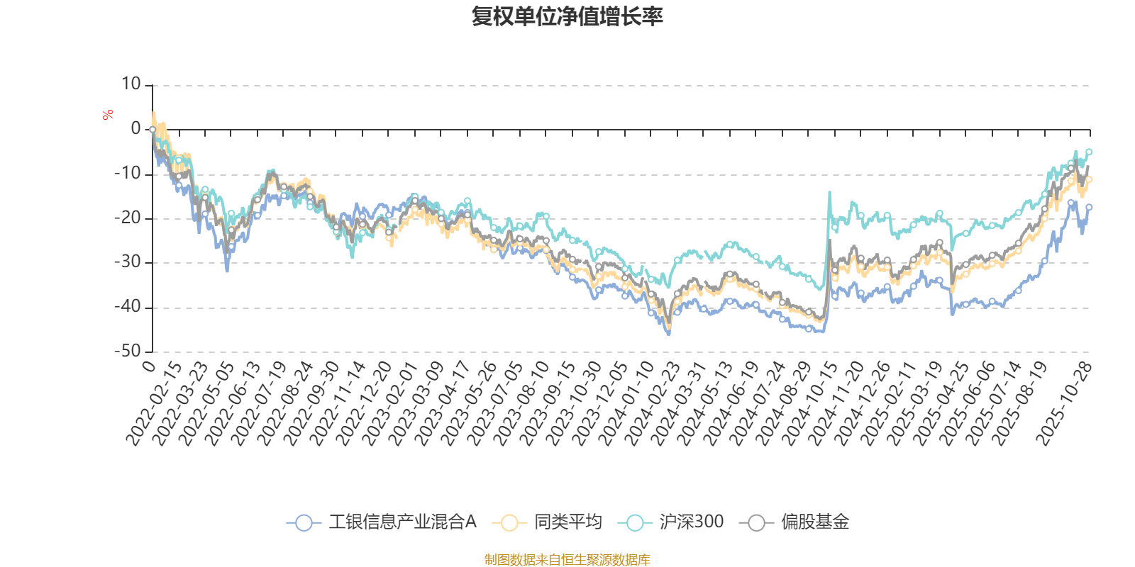 截至10月28日,工银信息产业混合A近三个月复权单位净值增长率为23.62%,位于同类可比基金60/265;近半年复权单位净值增长率为36.63%,位于同类可比基金81/265;近一年复权单位净值增长率为28.86%,位于同类可比基金120/265;近三年复权单位净值增长率为5.80%,位于同类可比基金186/253。
