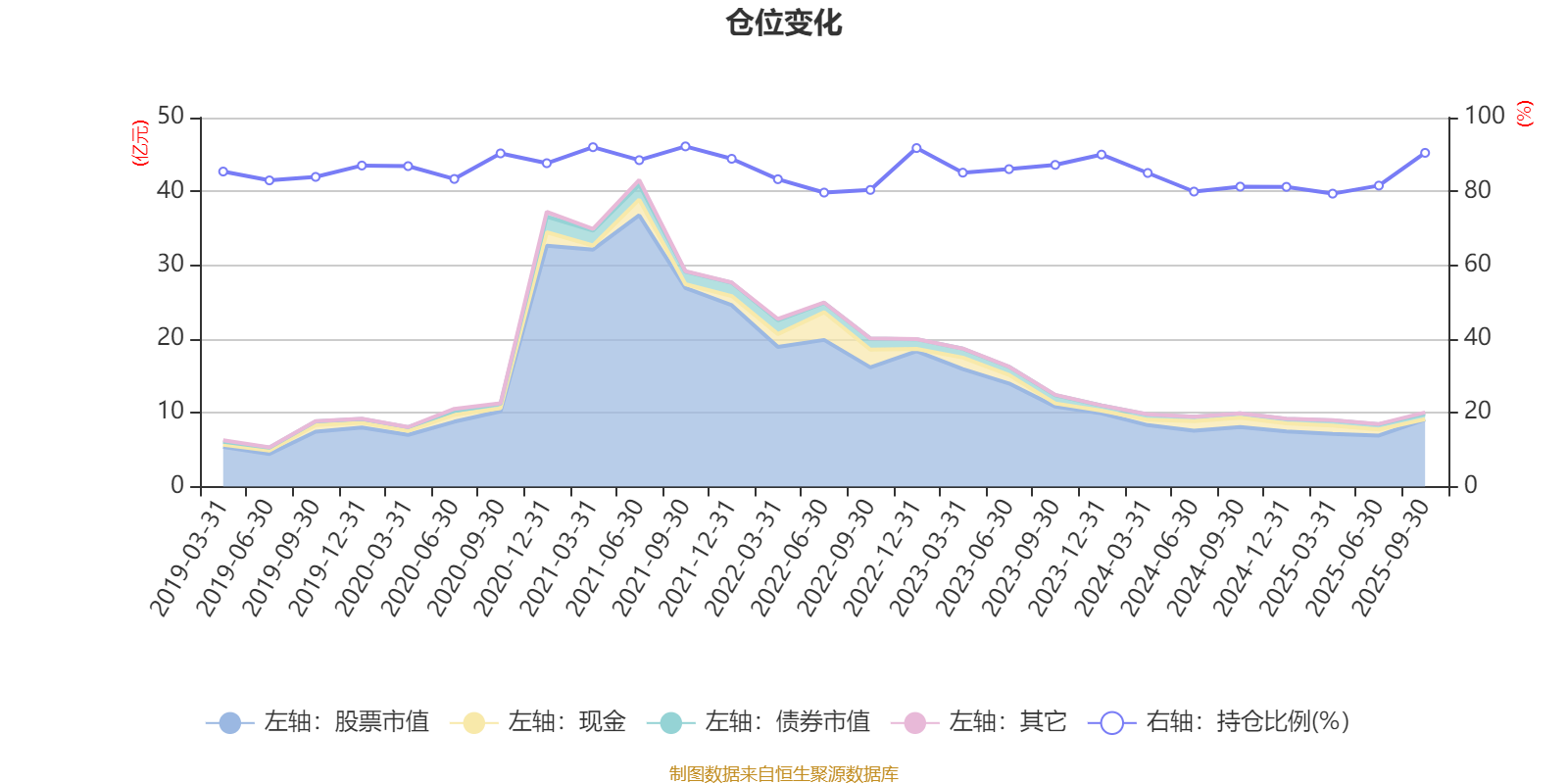 据定期报告数据统计,近三年平均股票仓位为84.91%,同类平均为85.99%。2021年三季度末基金达到92.2%的最高仓位,2025年一季度末最低,为79.39%。