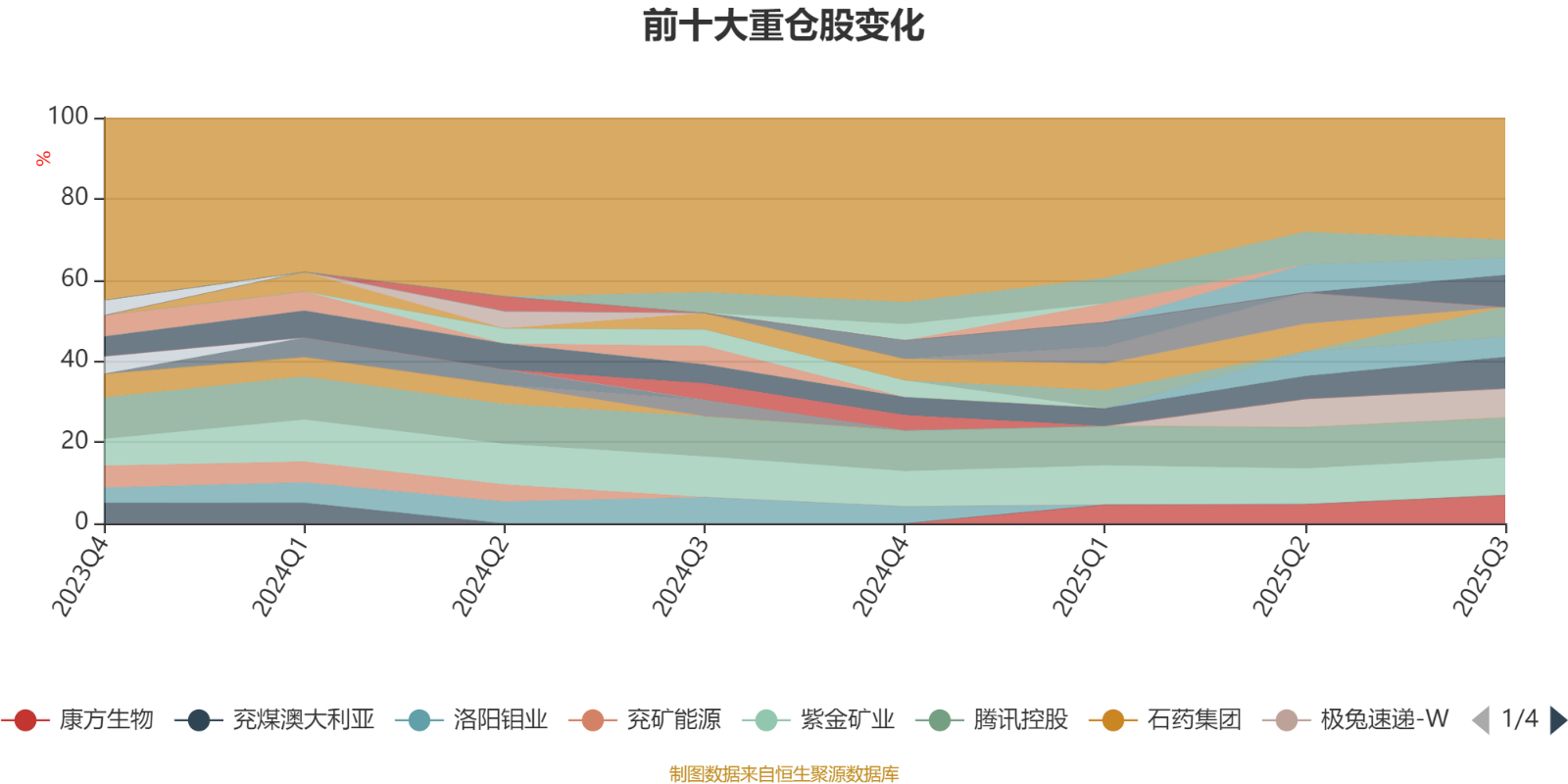 该基金持股集中度较高。截至2025年三季度末,基金十大重仓股分别是腾讯控股、紫金矿业、华虹半导体、中国海洋石油、中国铝业、极兔速递-W、康方生物、药师帮、美团-W、德康农牧。